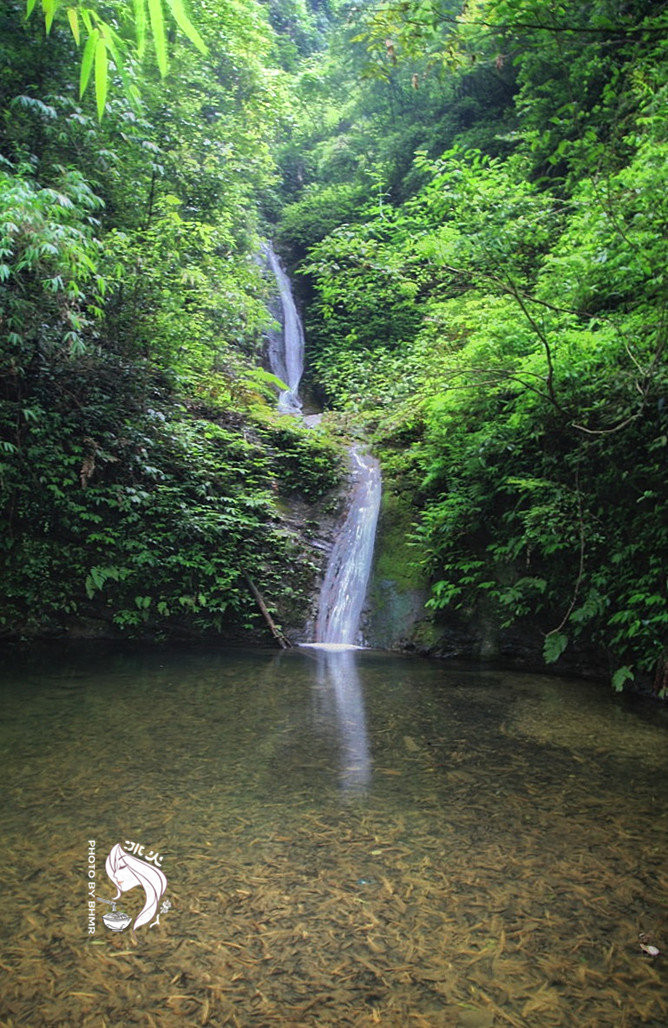 往彩色森林的路上,就会经过响水湖。响水湖堤坝外有一挂瀑布,共12级,落差近百。瀑布流水之时,声若惊雷,极其响亮,几十米外清晰可闻,故此,村民们将此湖命名为“响水湖”。