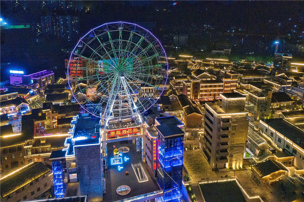 南川东街打造的全国首座凌驾于两栋“老建筑”上的摩天轮,高约40米,不仅是东街的亮点、也是整个南川城区的亮点。