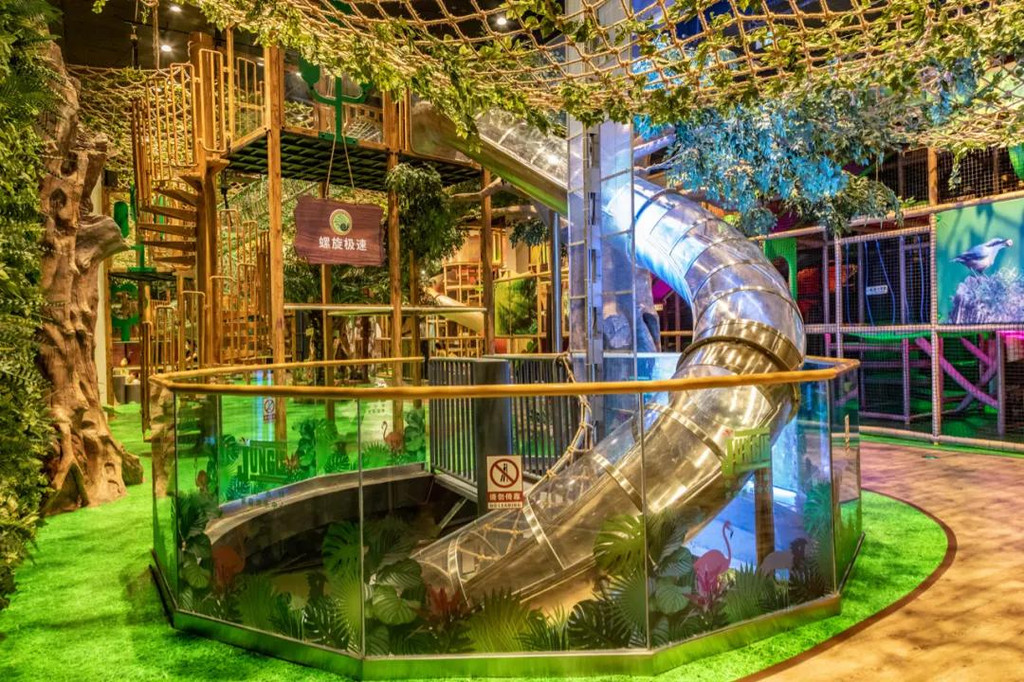 奇幻丛林中有一个长达10米的旋转滑梯,它贯穿了2层楼的空间,抱着双臂从3楼通过滑梯隧道加速滑向2楼,速度挺快,超级刺激,我是没敢玩,我老公玩了2次,乐此不疲!