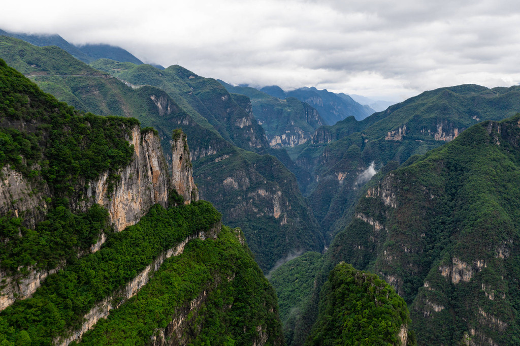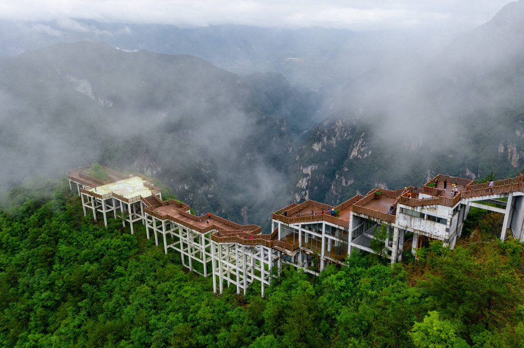 摇曳于神女溪,眼前奇花曼妙,感悟自然,陶冶于山间,已是惬然。漫步神女天路,看云卷云舒。透雾看去只见山河万里,亦可览九州五岳。亭台错落,恰似天宫云阙。