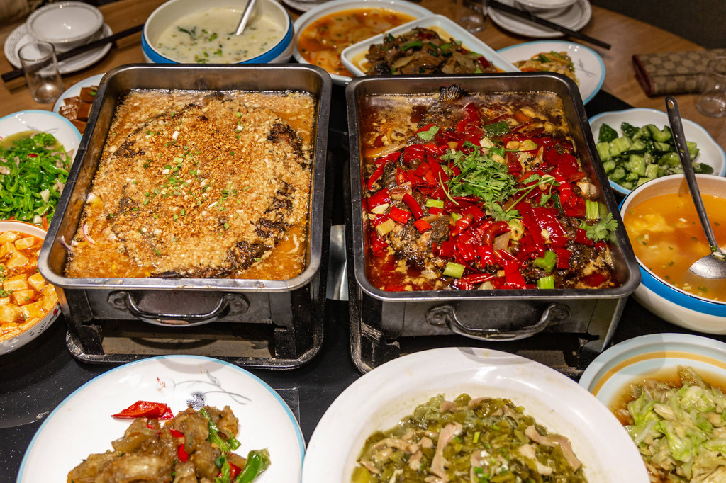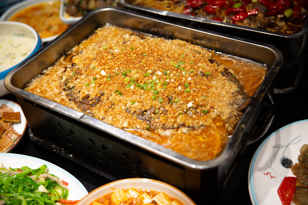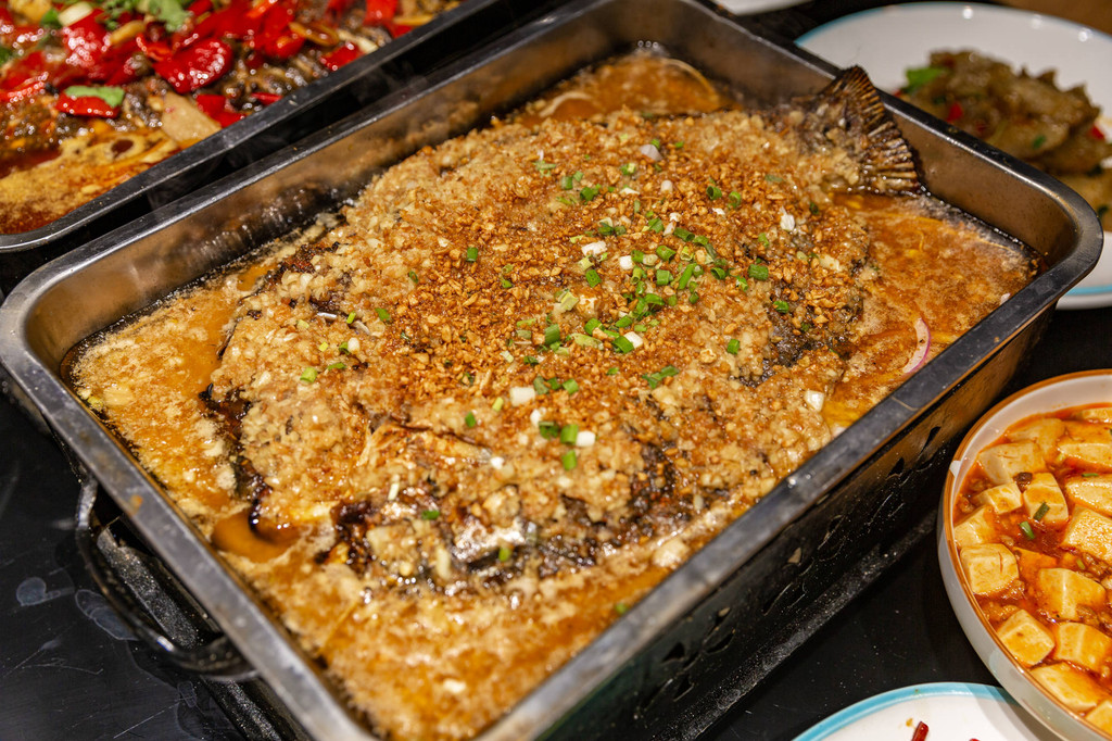寻味至此,迫不及待点上一条烤鱼,鱼肉含蛋白质、钙、磷等可增强记忆、思维和分析能力,延缓脑力衰退,此菜不仅美味且营养丰富。万州烤鱼将腌,烤,炖三种烹饪方法有机集合,看那在铁夹中的鱼被烤的香气四溢,身泛金黄,就不由得垂涎三尺了。这洒满香料的烤鱼和丰富的配菜,让我们迅速动筷,每一口都深入灵魂,万州不愧是以烤鱼出名,得尝此鱼也算是不负万州之行了。