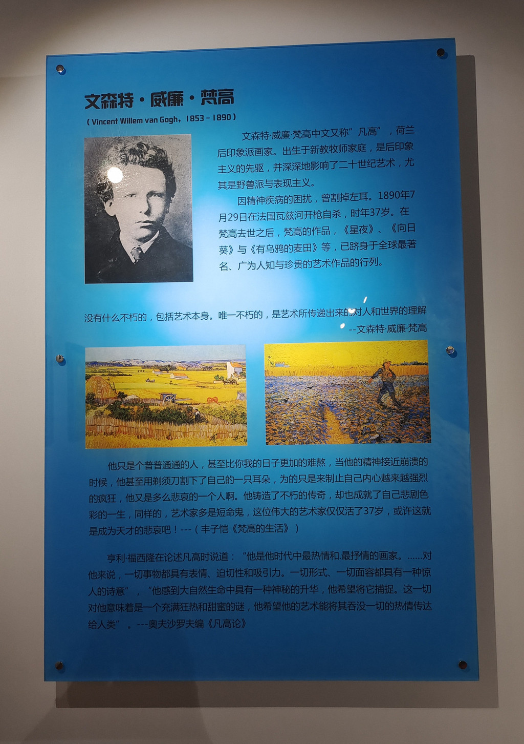 3、旁边还有梵高的生平简介,简直可以说是很贴心了,虽然只有寥寥几字,但却道出梵高一生的起起伏伏,他的物理生命虽然短暂,但是他的艺术生命源远流长。