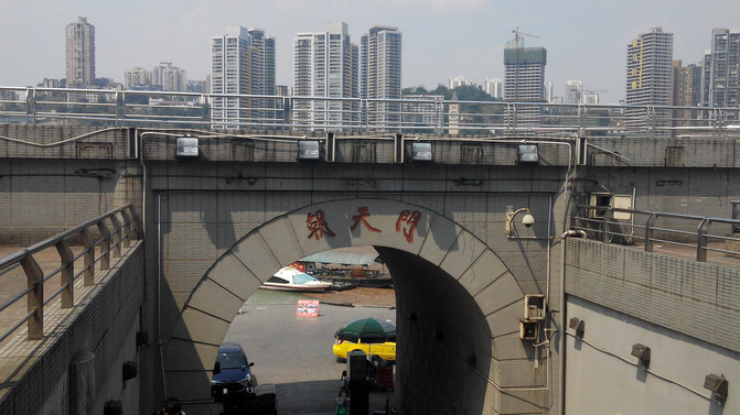 朝天门广场上面正在修,不能上,得随着朝天门码头往下走较长一段路,到头后,你便会看到清澈的嘉陵江和脏兮兮的长江交汇,太神奇了。