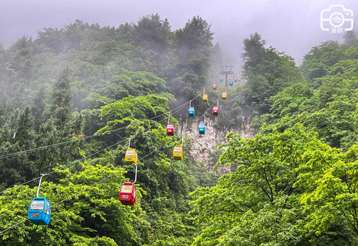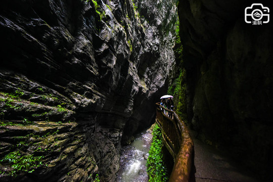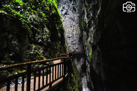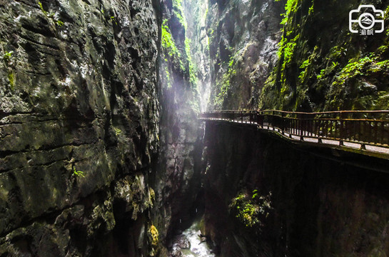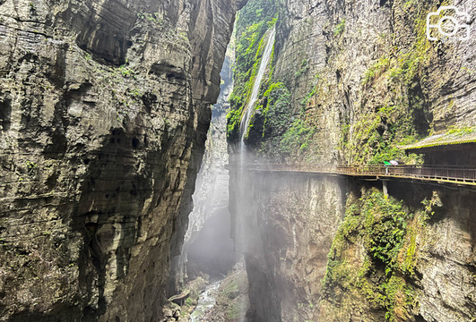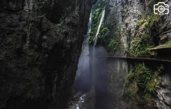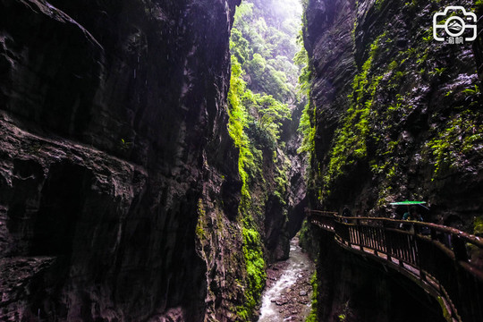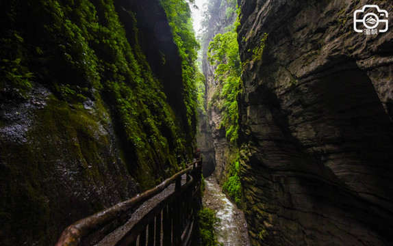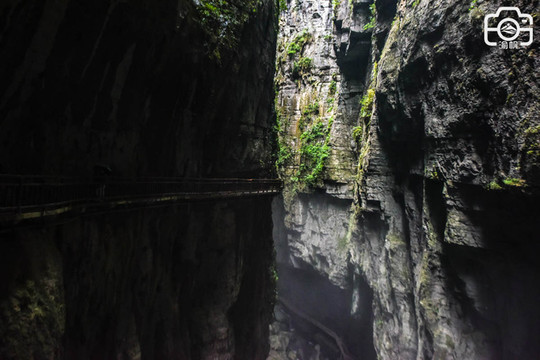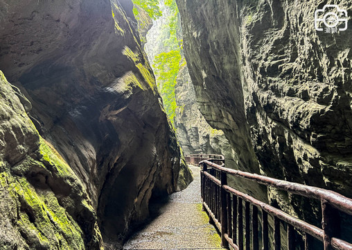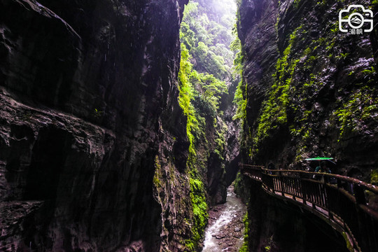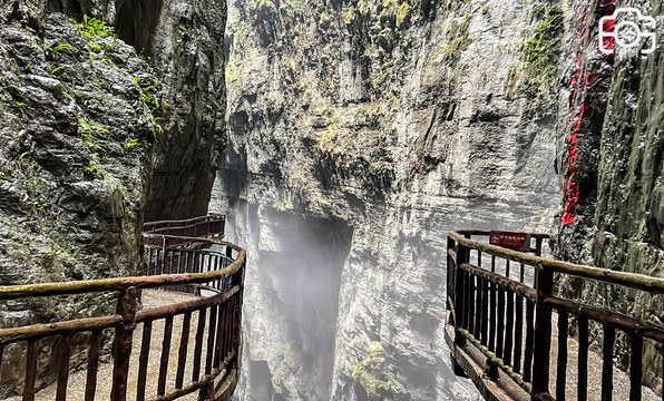 乘坐索道进入裂缝之中,抬头望天,高不见顶,仅能看到一线云天,因相对落差超过1300米,沿途飞泉流瀑,溪水潺潺,所以有中国第一动感峡谷之美誉。