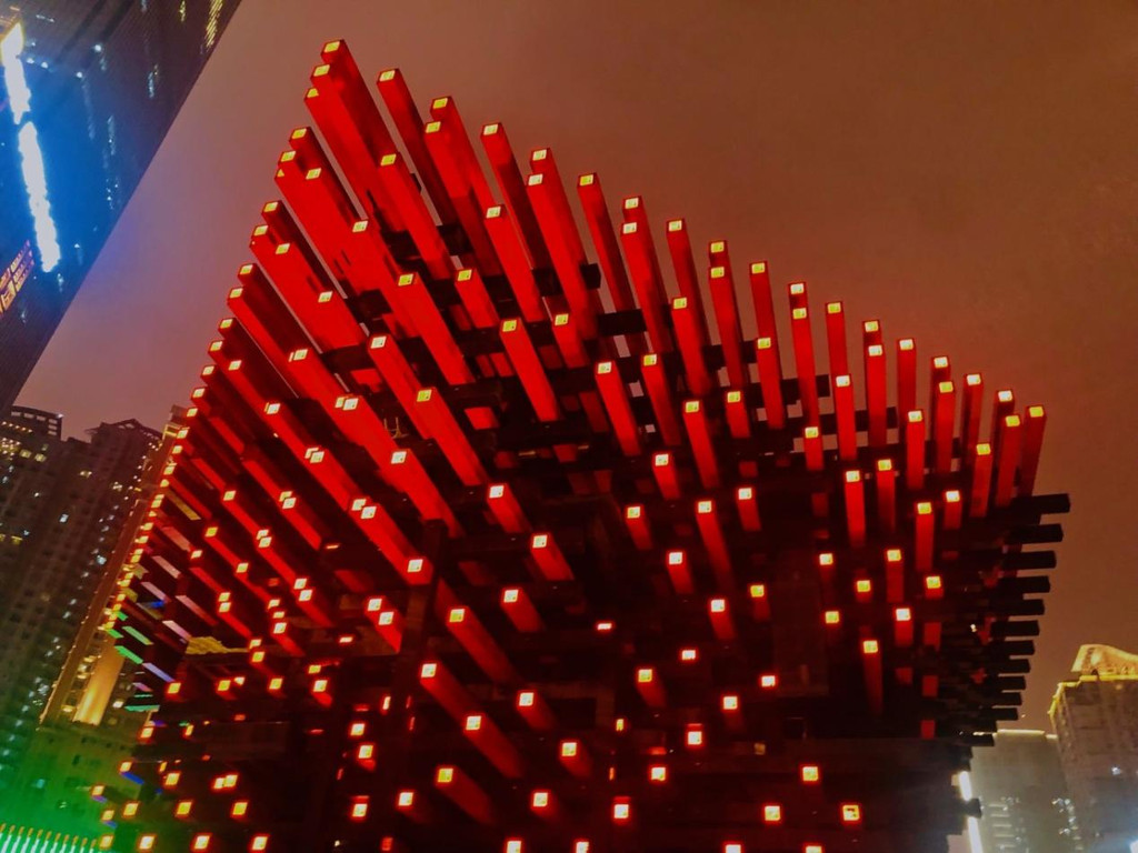 这里就能看到酒店在洪崖洞的好处了吧。我们当天匆匆路过了洪崖洞,然后在解放碑一带逛了起来。先说这个当代艺术中心,简直太有逼格了。这样看过去就好像是一根一根的柱子穿插出了一个不一样的世界。
