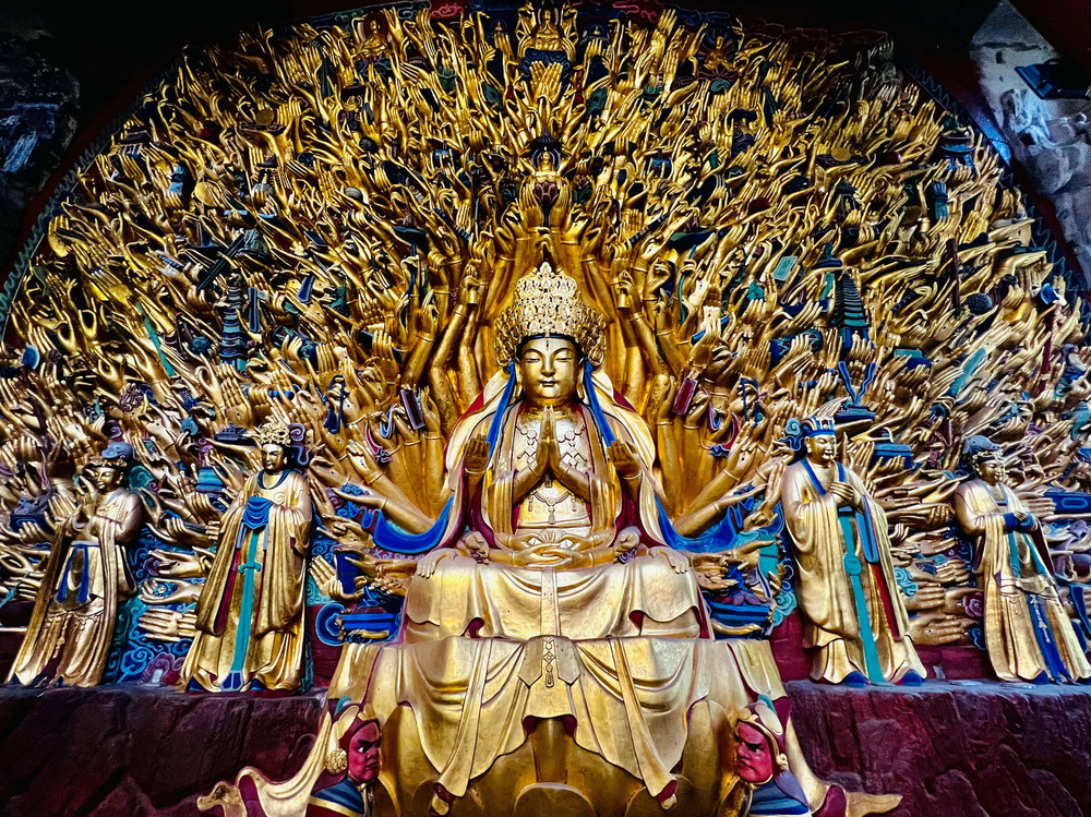 矗立于千手观音像前,不觉被其庄严肃穆的神情所吸引,不觉被其千变万化的手眼所震撼。从主像身侧及正上方呈放射状浮雕的近千只手臂。每只手臂的掌心中都有一只眼睛,每只手中也都持一种器物,日、月、宝、宝剑、净瓶、杨枝、白拂、宝瓶、盾牌、钺斧、数珠、金刚杵、莲花、宝镜、宝印、五色云、绢索...等等等等,其姿势或伸、或屈、或正、或侧,真正展现出千面、千手、千眼的无穷变化。