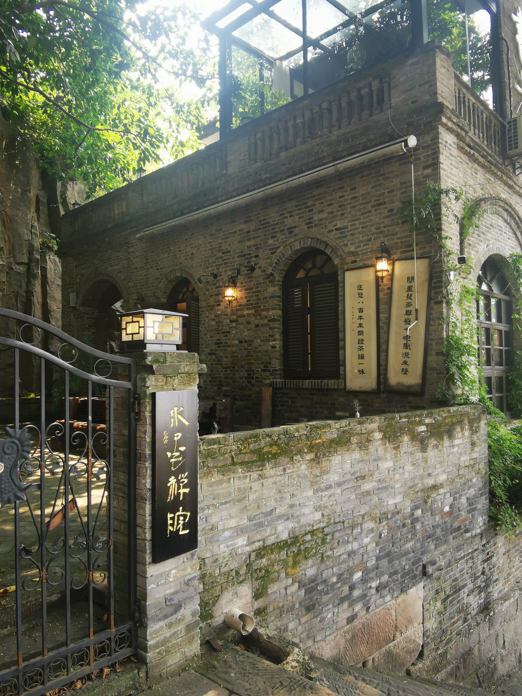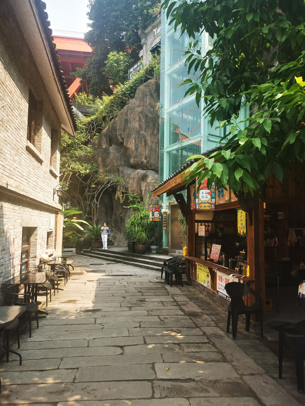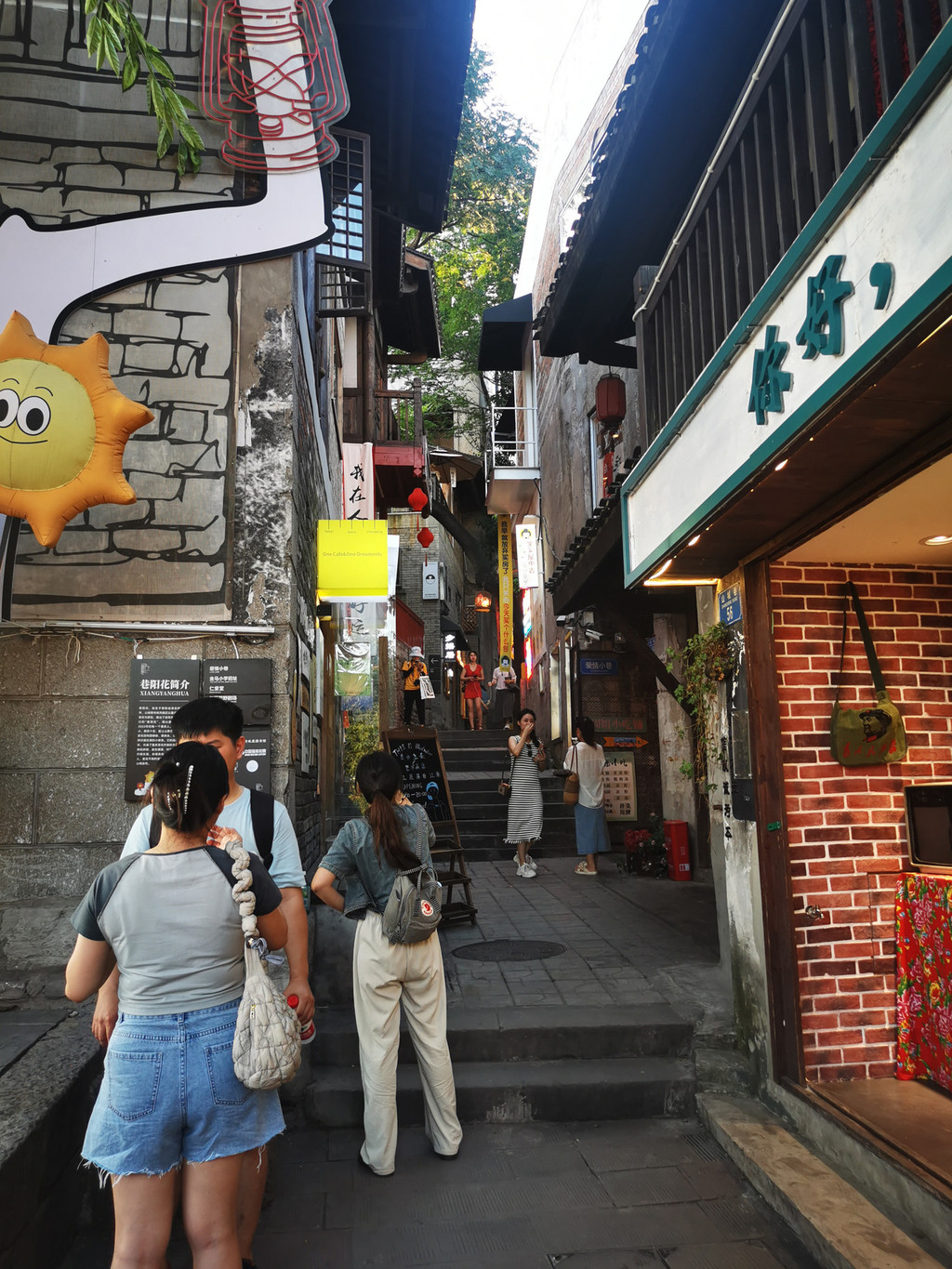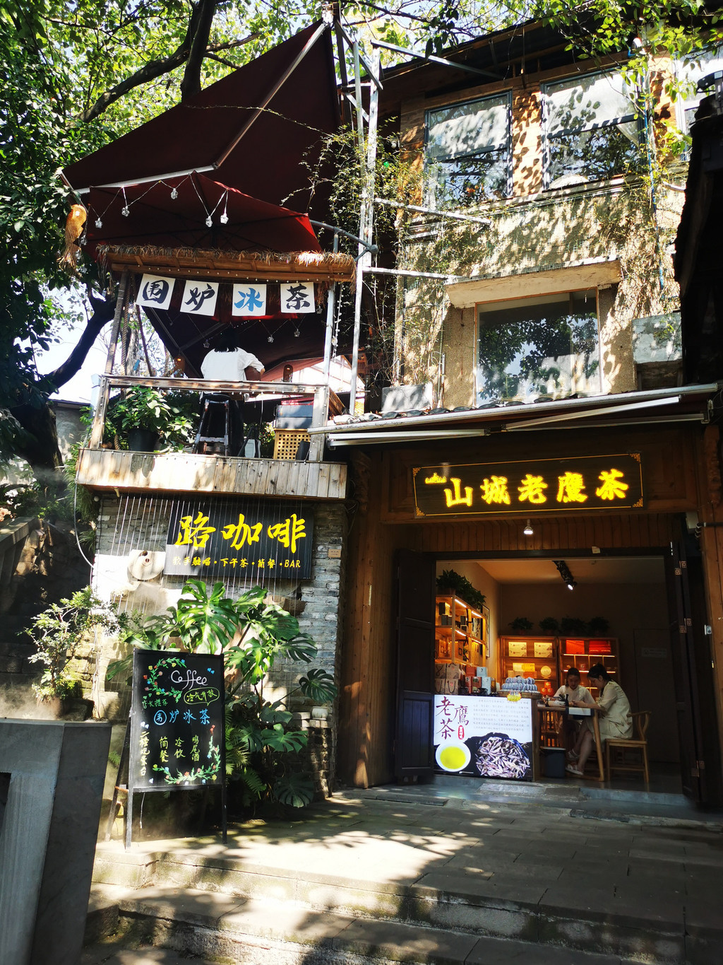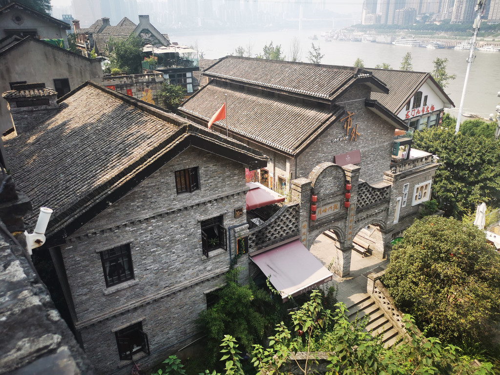 龙门浩老街。乘坐长江索道从北到南跨越长江,来到坐落于长江南岸的龙门浩老街。龙门浩面向长江,背靠南山,渝中盛景尽收眼底。这里曾是民国时期的高档住宅区,本地的富商、官员以及在华工作的外国人均居住于此。整个龙门浩依山而建、自上而下、高低错落。众多民国时期的老建筑经过重新整修,焕然一新,每层街道之间还加装了电梯,旧时的一座座建筑如今已变身为茶馆、咖啡馆西餐厅和各种小店铺。这种有着浓厚的历史气息和静谧安逸环境的地方,是我们十分喜爱的,我们几乎上上下下走了两个来回,还在这里吃了顿午饭,才恋恋不舍地离去。