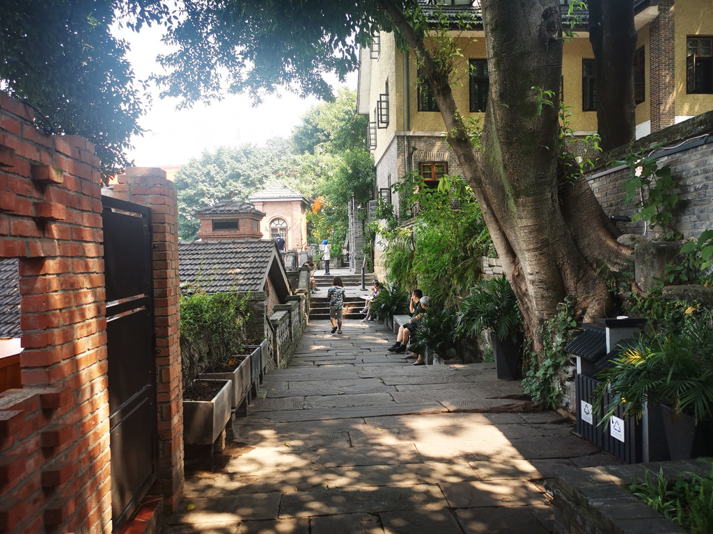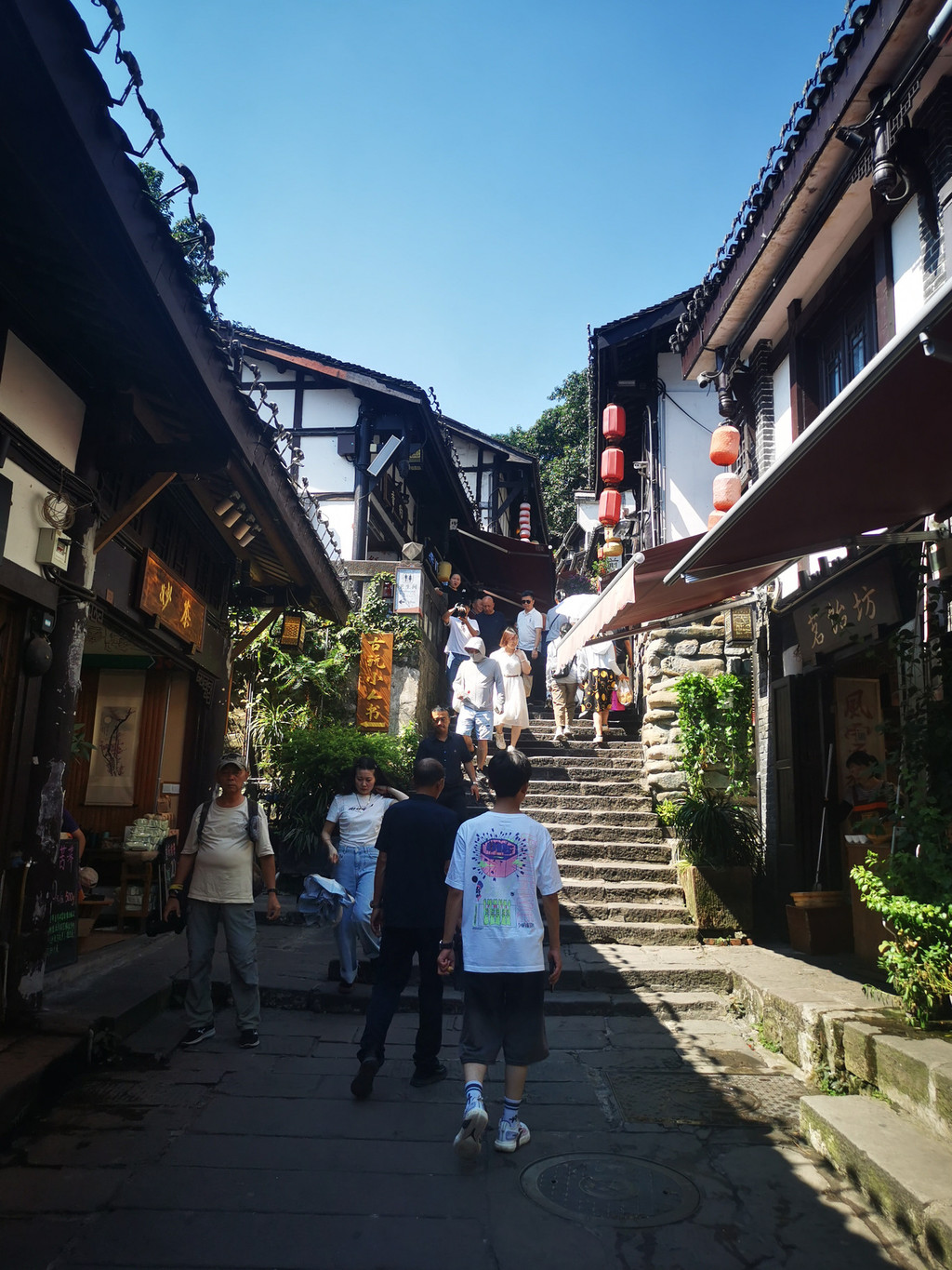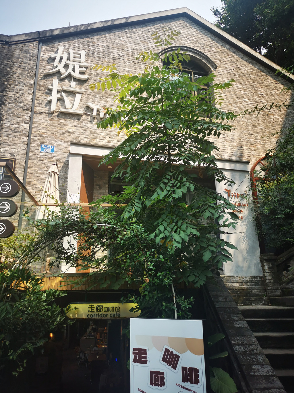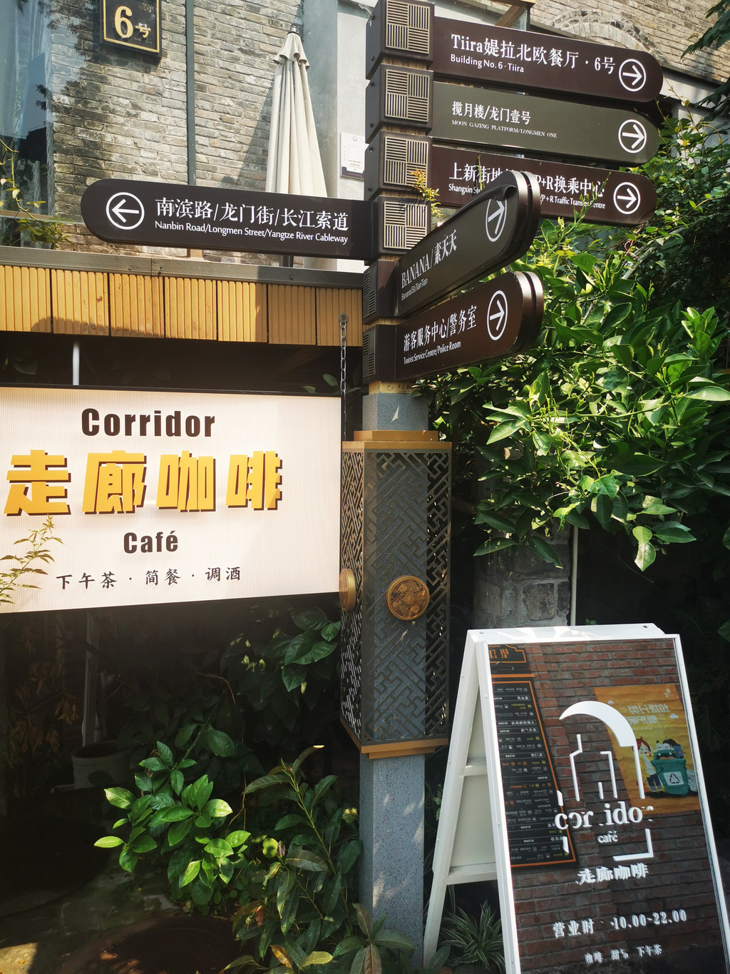 龙门浩老街。乘坐长江索道从北到南跨越长江,来到坐落于长江南岸的龙门浩老街。龙门浩面向长江,背靠南山,渝中盛景尽收眼底。这里曾是民国时期的高档住宅区,本地的富商、官员以及在华工作的外国人均居住于此。整个龙门浩依山而建、自上而下、高低错落。众多民国时期的老建筑经过重新整修,焕然一新,每层街道之间还加装了电梯,旧时的一座座建筑如今已变身为茶馆、咖啡馆西餐厅和各种小店铺。这种有着浓厚的历史气息和静谧安逸环境的地方,是我们十分喜爱的,我们几乎上上下下走了两个来回,还在这里吃了顿午饭,才恋恋不舍地离去。