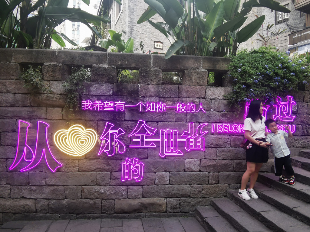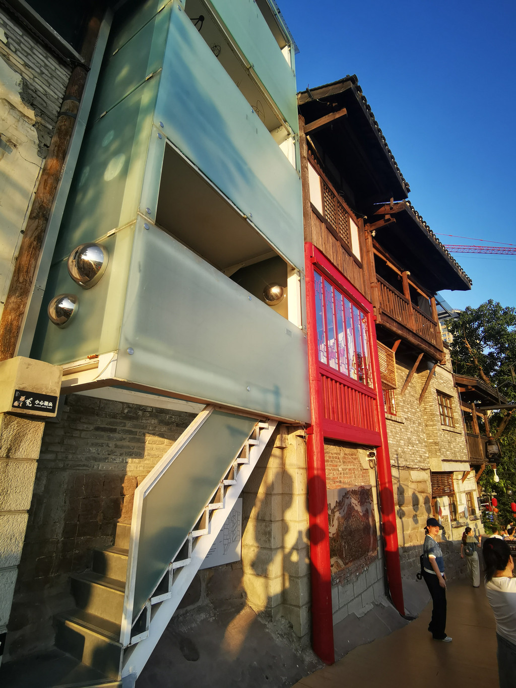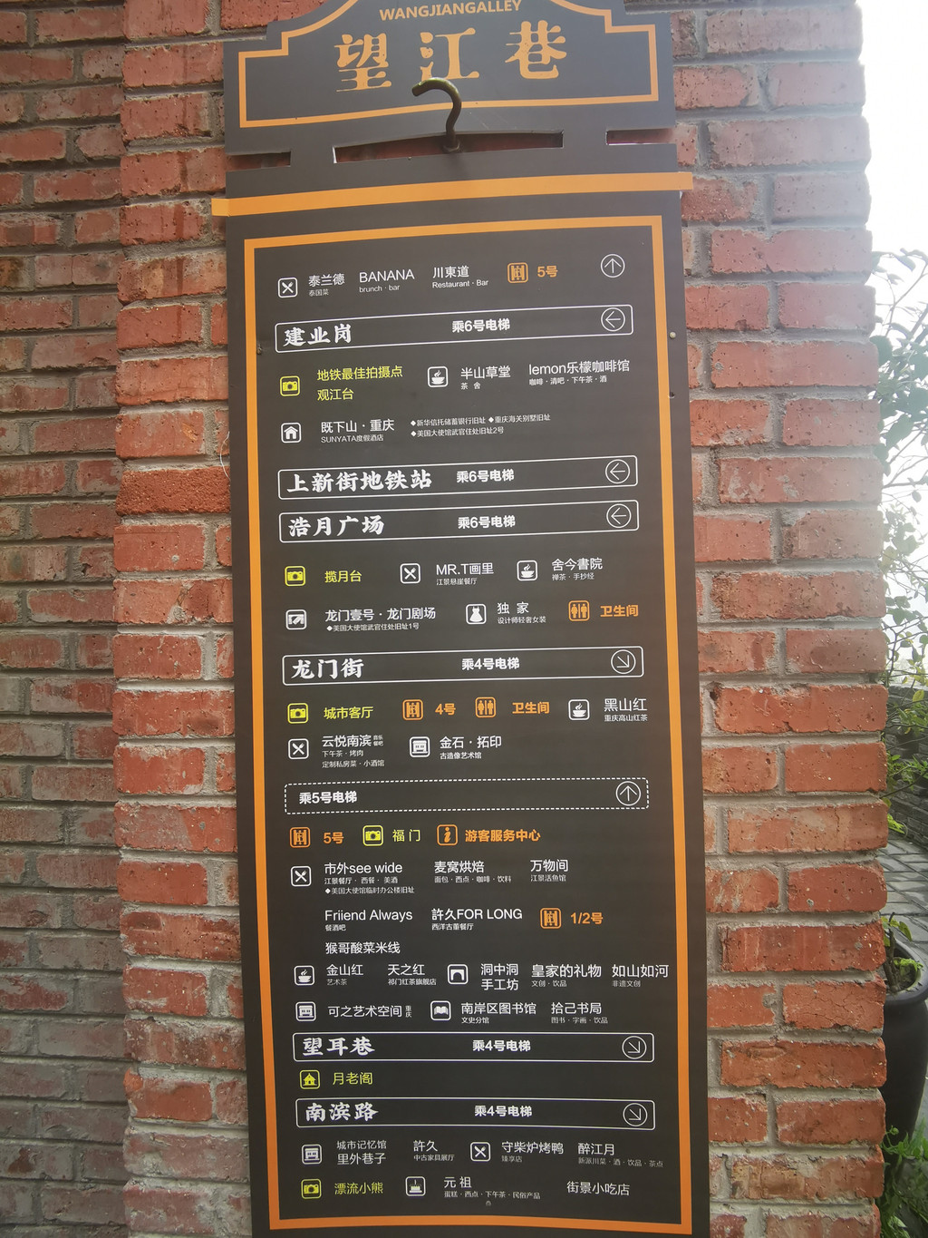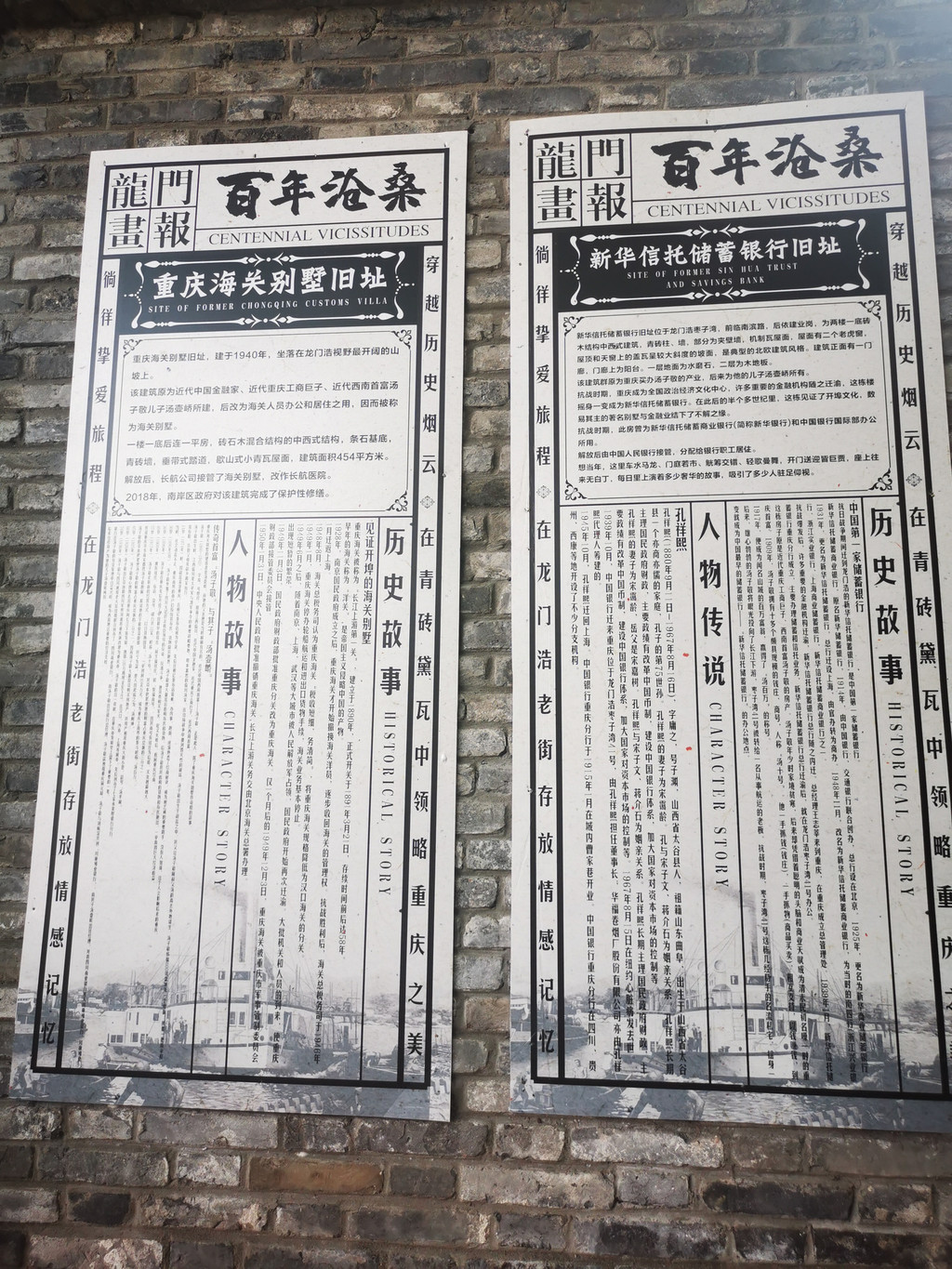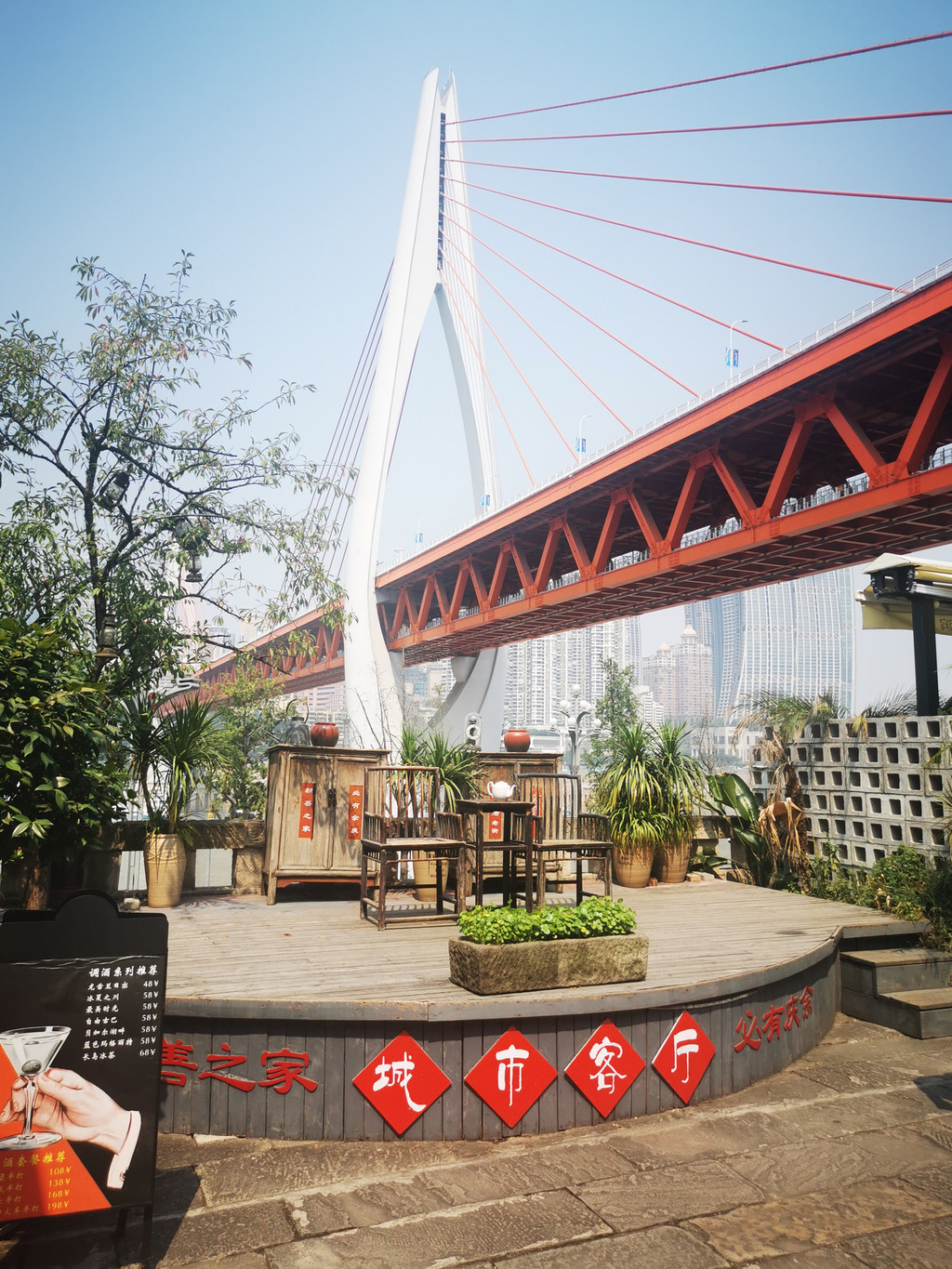 龙门浩老街。乘坐长江索道从北到南跨越长江,来到坐落于长江南岸的龙门浩老街。龙门浩面向长江,背靠南山,渝中盛景尽收眼底。这里曾是民国时期的高档住宅区,本地的富商、官员以及在华工作的外国人均居住于此。整个龙门浩依山而建、自上而下、高低错落。众多民国时期的老建筑经过重新整修,焕然一新,每层街道之间还加装了电梯,旧时的一座座建筑如今已变身为茶馆、咖啡馆西餐厅和各种小店铺。这种有着浓厚的历史气息和静谧安逸环境的地方,是我们十分喜爱的,我们几乎上上下下走了两个来回,还在这里吃了顿午饭,才恋恋不舍地离去。