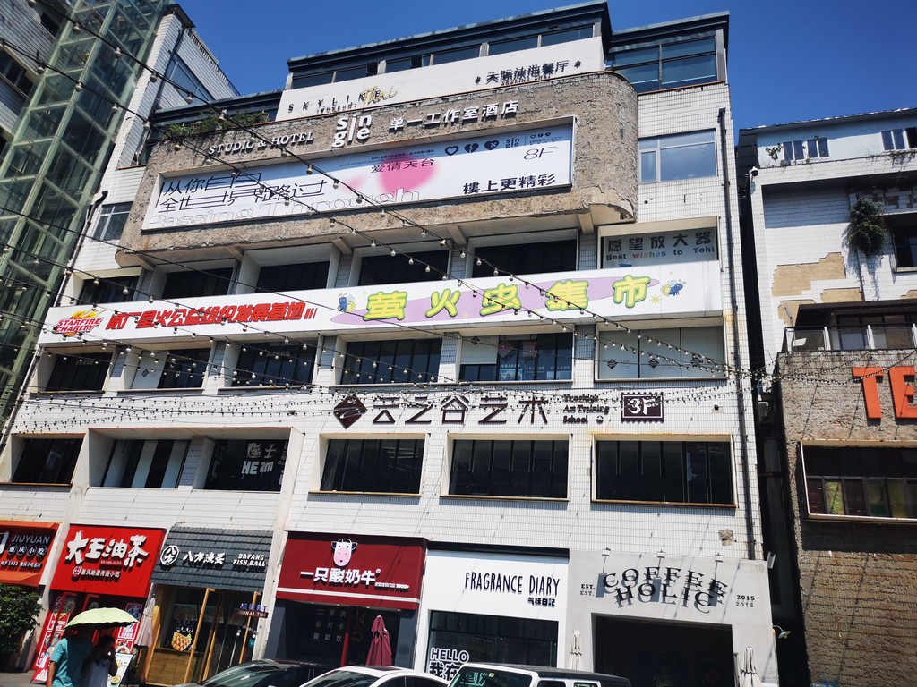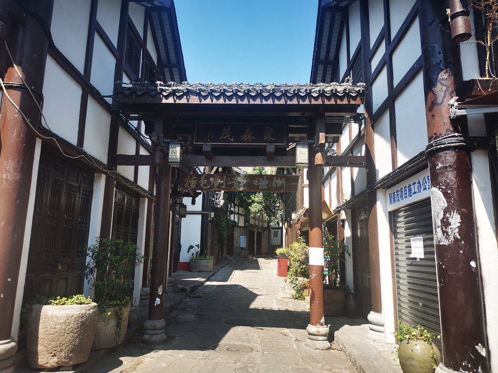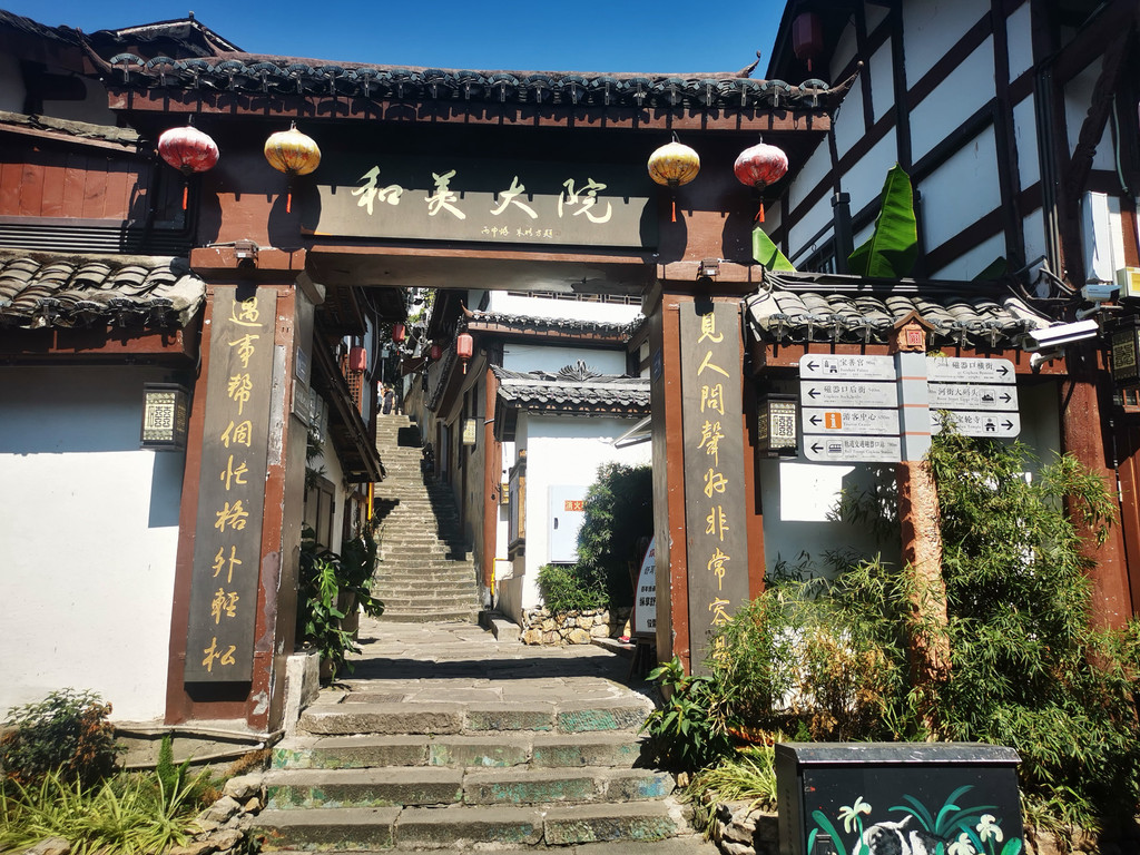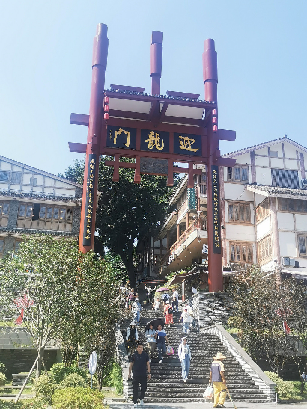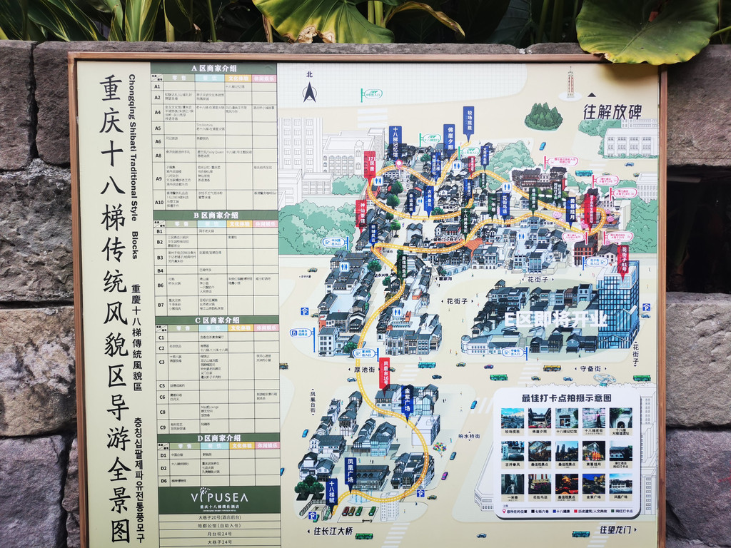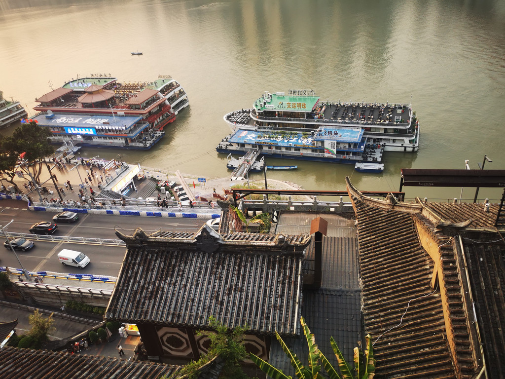 龙门浩老街。乘坐长江索道从北到南跨越长江,来到坐落于长江南岸的龙门浩老街。龙门浩面向长江,背靠南山,渝中盛景尽收眼底。这里曾是民国时期的高档住宅区,本地的富商、官员以及在华工作的外国人均居住于此。整个龙门浩依山而建、自上而下、高低错落。众多民国时期的老建筑经过重新整修,焕然一新,每层街道之间还加装了电梯,旧时的一座座建筑如今已变身为茶馆、咖啡馆西餐厅和各种小店铺。这种有着浓厚的历史气息和静谧安逸环境的地方,是我们十分喜爱的,我们几乎上上下下走了两个来回,还在这里吃了顿午饭,才恋恋不舍地离去。