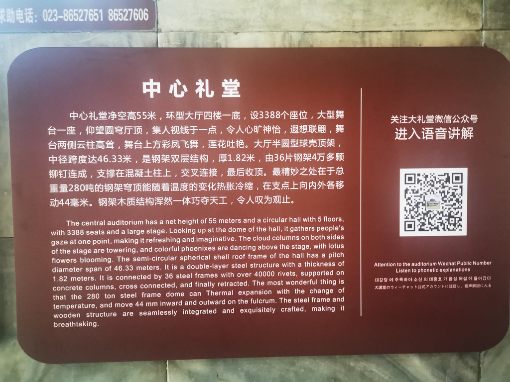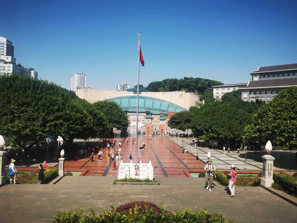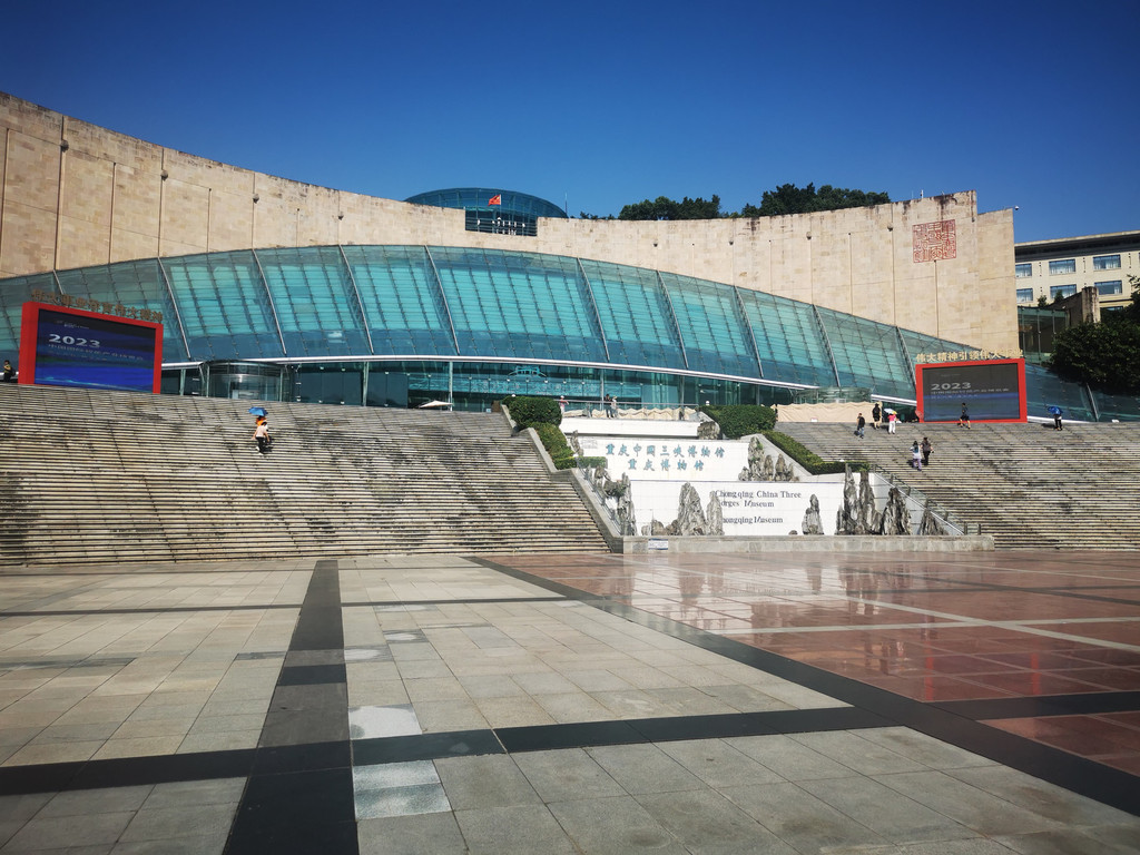 重庆中国三峡博物馆。人民大礼堂对面就是三峡博物馆。“重庆中国三峡博物馆位于重庆人民大礼堂中轴线上,馆舍由主馆、重庆白鹤梁水下博物馆、重庆宋庆龄纪念馆、涂山窑遗址、重庆三峡文物科技保护基地五个场馆组成,占地面积5万平方米,建筑面积7.17万平方米,展厅面积2.7万平方米,年均服务观众超300万人次。主馆于2005年6月18日正式对外开放,位于重庆市渝中区人民路236号,与相邻的重庆市人民广场、人民大礼堂共同形成“三位一体”的城市标志性建筑群。”(摘自360百科)