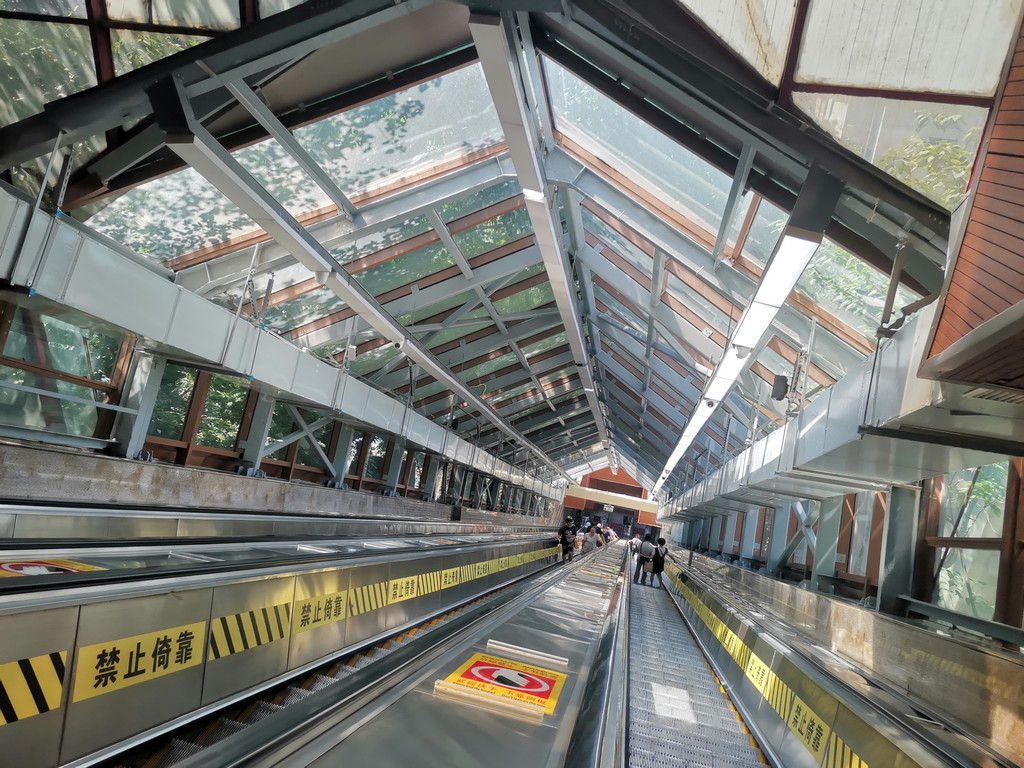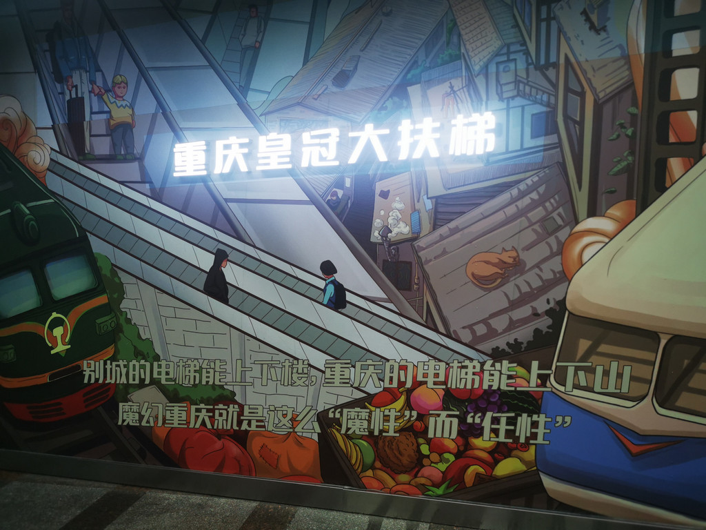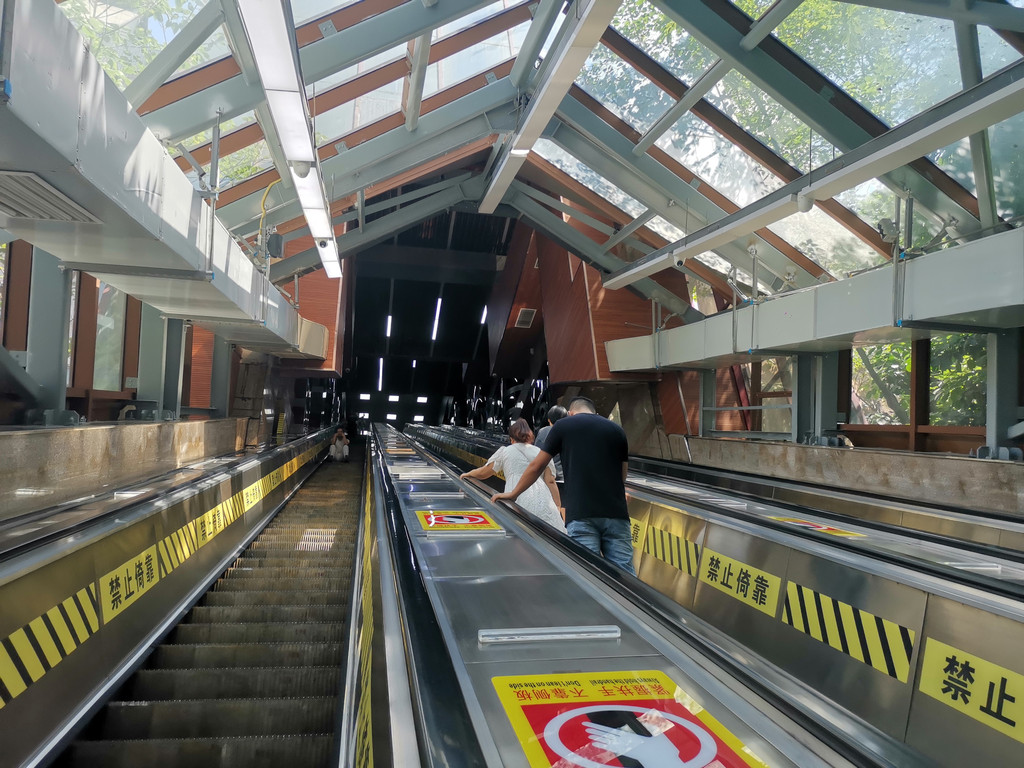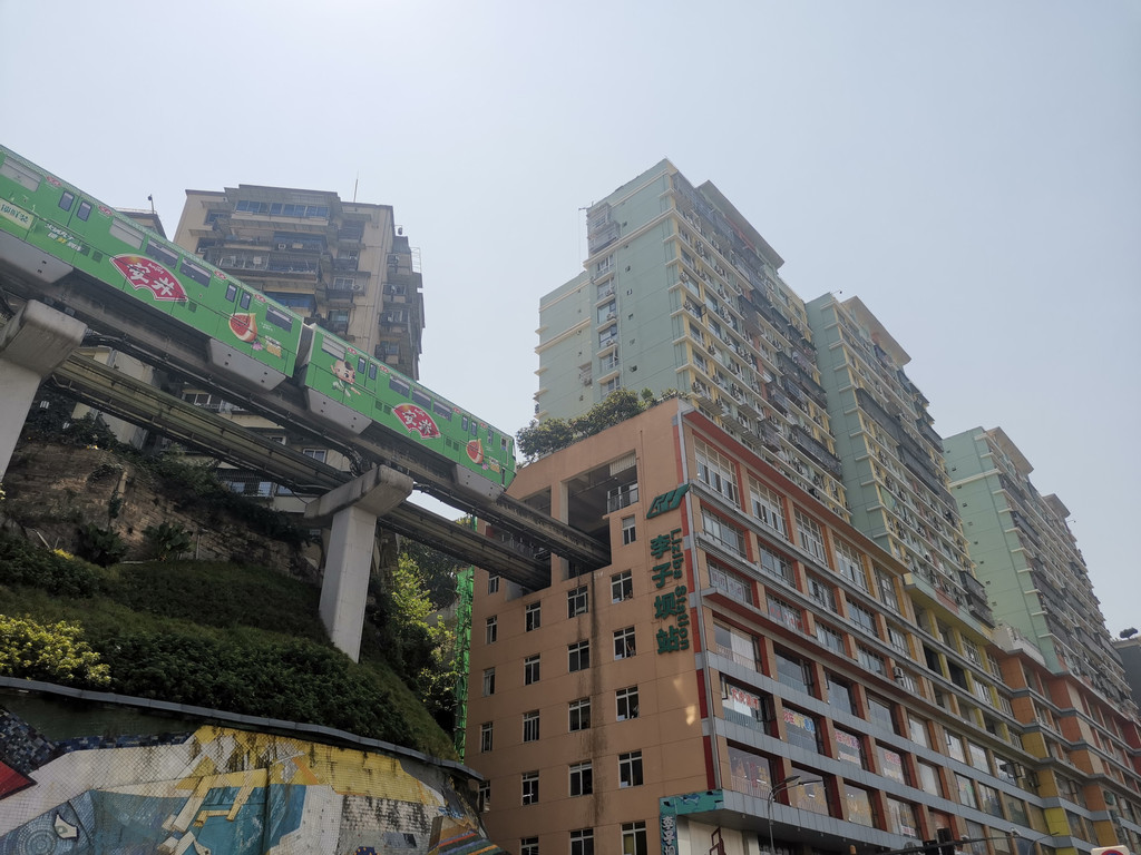李子坝轻轨站观景台。重庆轻轨二号线李子坝站位于一座大楼中,因此这里也成为游客观看轻轨列车穿楼的网红打卡点。这张照片是出站时在大楼里拍的,照片右下角阴影处人头涌涌,都是在等着拍摄列车穿楼的。我们去时正值逆光,没有拍出好看的照片。