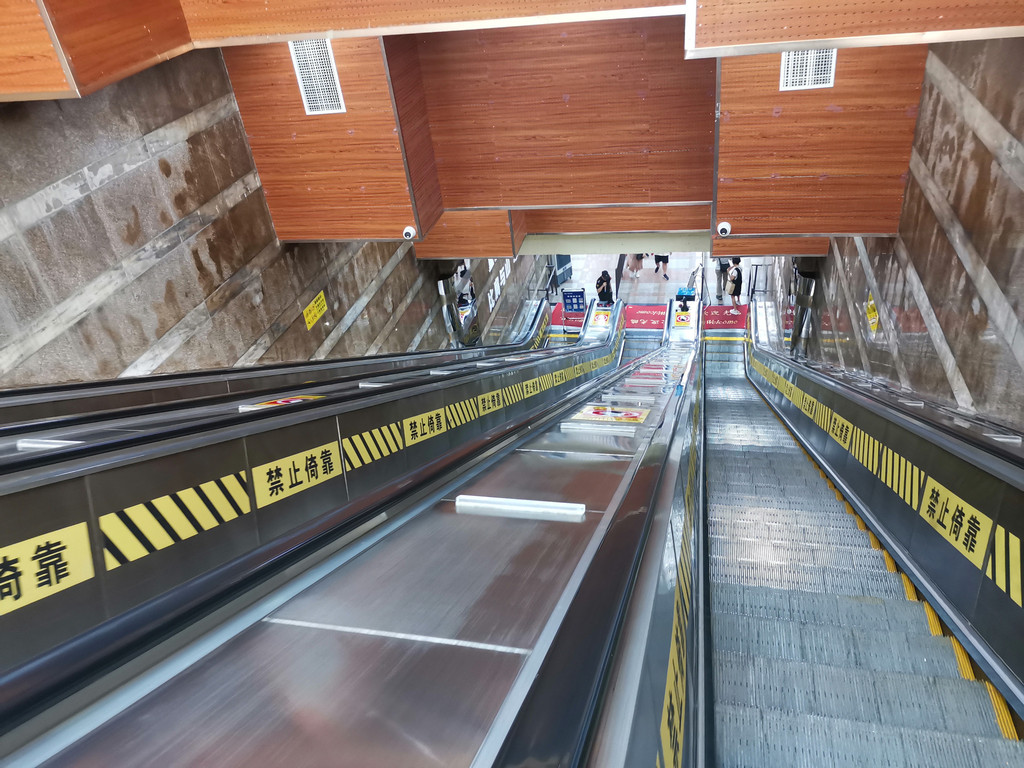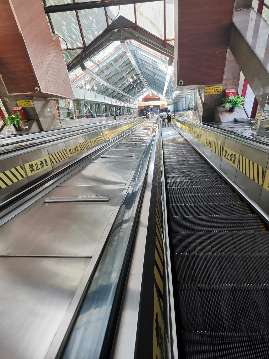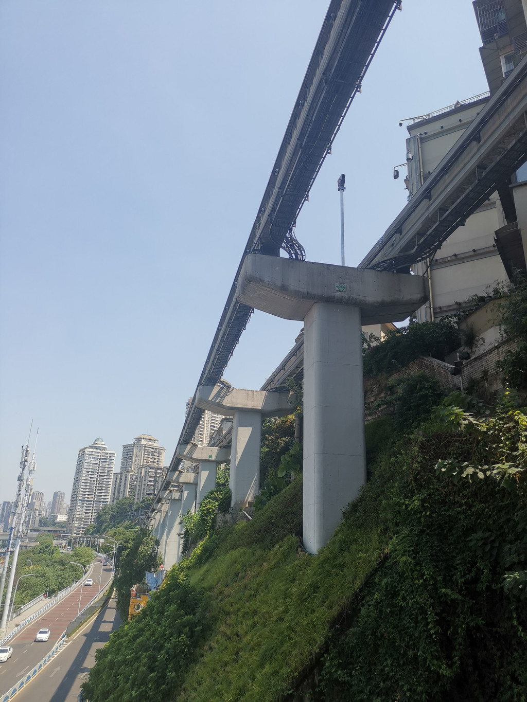李子坝轻轨站观景台。重庆轻轨二号线李子坝站位于一座大楼中,因此这里也成为游客观看轻轨列车穿楼的网红打卡点。这张照片是出站时在大楼里拍的,照片右下角阴影处人头涌涌,都是在等着拍摄列车穿楼的。我们去时正值逆光,没有拍出好看的照片。