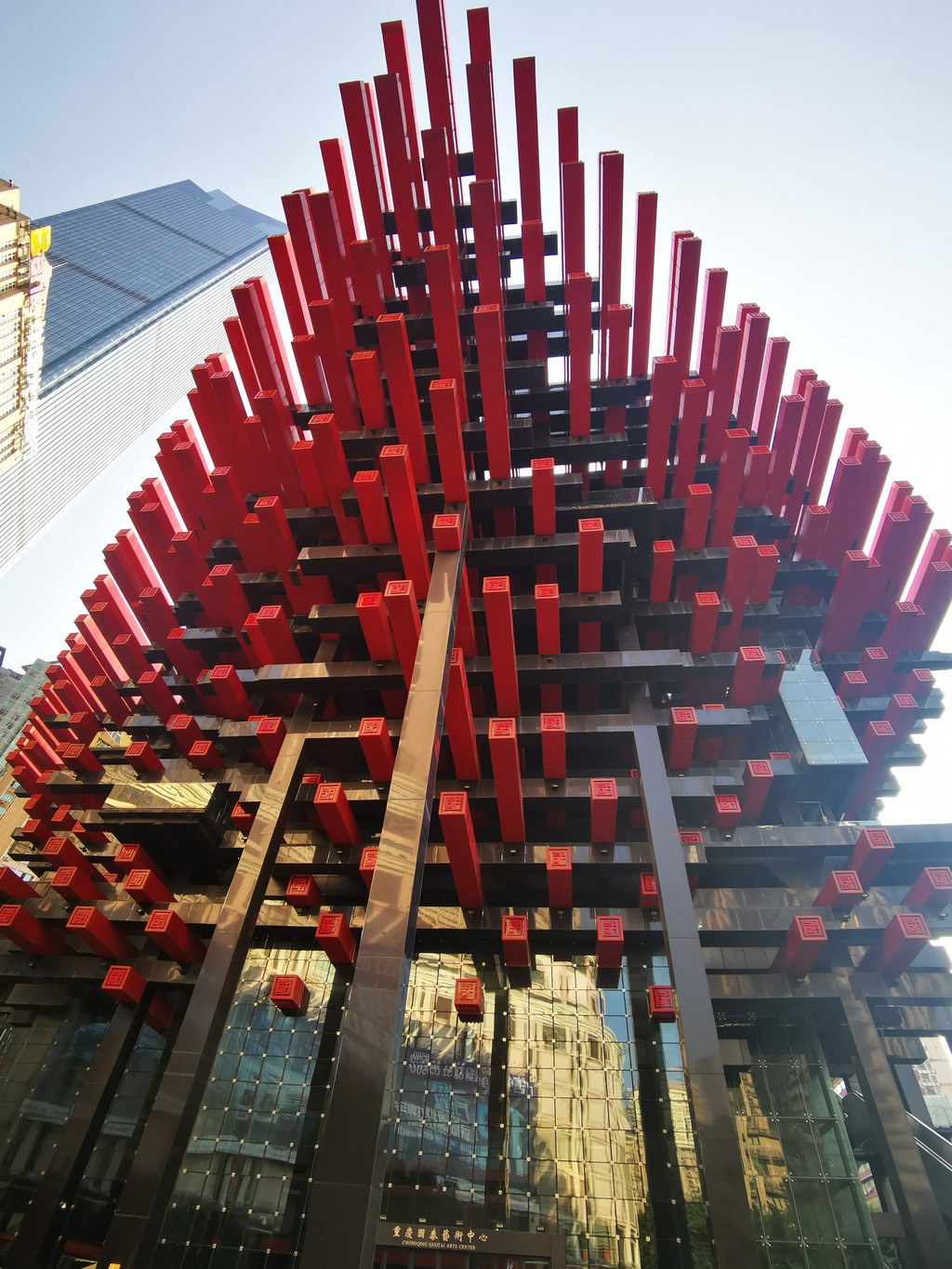 国泰艺术中心(筷子楼)。“重庆国泰艺术中心由国泰大剧院和重庆美术馆两部分组成,占地面积达到2.91公顷,建筑面积3.5万平方米。国泰大剧院由一个800座的中型剧场和两个350座的观演厅组合而成;而重庆美术馆则是按中等规模定位,主要承接中国国内外工艺美术品展览,同时举办各类文化艺术交流活动。建筑外形特点是黑红两色的"题凑"交织堆砌,远远望去像一团熊熊燃烧的篝火。”(摘自360百科)