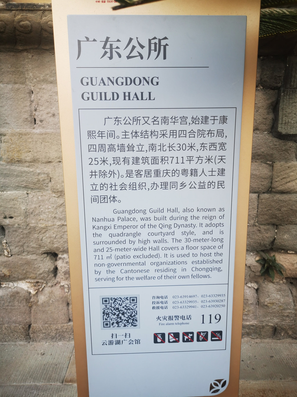 湖广会馆。坐落于重庆市渝中区长江河畔的古东水门一侧,由高墙环绕的禹王宫、齐安公所、广东公所三大会馆组成,距今已有近300年历史,是我国现存规模最大、保存最完好的古会馆建筑群。
