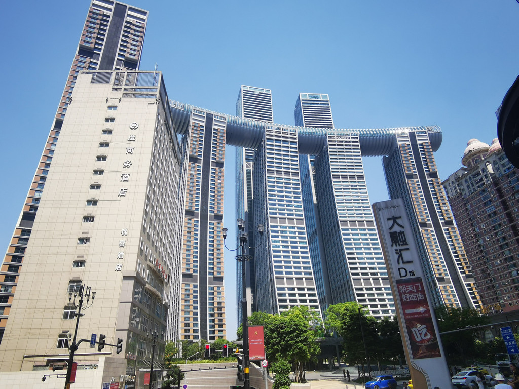 来福士广场。“重庆来福士(Raffles City ChongQing),位于重庆市渝中区朝天门接圣街8号,形象名"朝天扬帆",由世界知名建筑大师摩西·萨夫迪设计,由新加坡凯德集团投资,投资总额超过240亿元,总建筑面积超过112万平方米,是新加坡在华最大的投资项目,于2019年分阶段投入使用。重庆来福士由8座塔楼和一个5层商业群楼组成,是一个集住宅、办公楼、商场、服务公寓、酒店、餐饮会所为一体的城市综合体。它整合了陆地和水运的各种公共交通设施,设置了地下停车场、地铁站、公交中转站、码头和游客中心。2020年11月18日,当选"成渝十大文旅新地标"。 2021年5月21日,重庆来福士获得"最佳高层建筑(300-399米)"、"消防与风险工程奖"、"结构工程奖"三个奖项。”(摘自360百科)