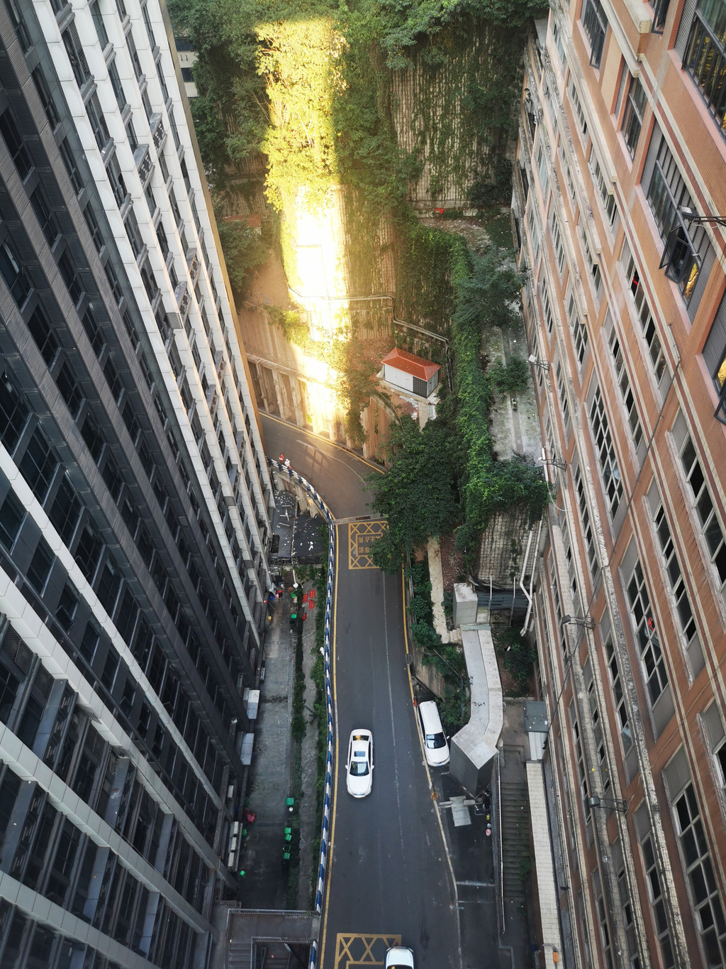 广场的尽头是两座桥与对面那座大楼相连接。站在桥上往下看,才发现我们原来真是站在22层楼这么高的地方哟。