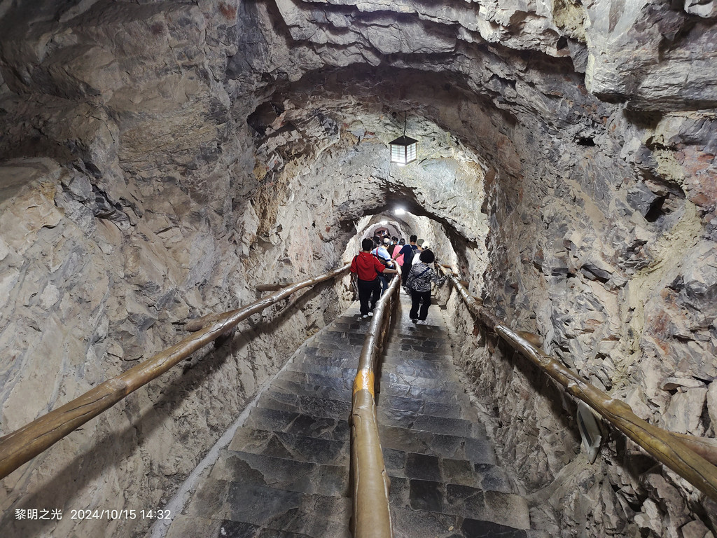 后又坐电梯下行,出了电梯,沿着栈道走,前面是被称为蛟龙寒窟的一个大洞,看过去黑乎乎一片,有些阴森,迎面吹来一阵阵冷飕飕的风。