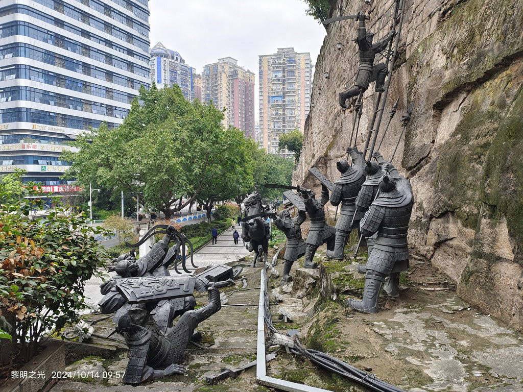 我们一路爬爬爬,沿着江边的步道,一直上行走到兴隆路出口,再到通远门。通远门是重庆城唯一座通往外地的陆路起点,这里有城墙遗址,有叙述老城墙筑城、守城、攻城的雕塑等。我们穿过城门,登上城墙,又从领事巷进入山城步道,一路浏览,一路下行,感受老重庆的街巷风韵。
