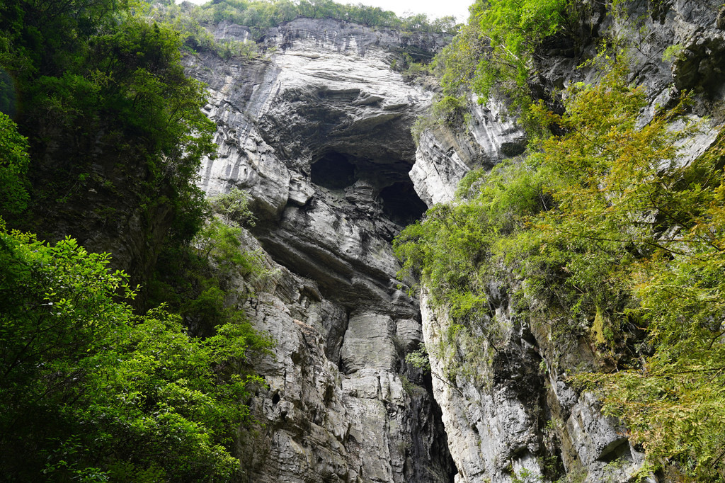 往前是青龙桥,回望天龙桥,才能看出这座桥的面目了!桥中有洞,洞中生洞,洞如迷宫,既壮观又神奇。再看青龙桥下方桥孔形如一把大刀,二个桥之间构成一巨大的天坑,名为天龙天坑。过了青龙桥回望桥孔,又变成了一条跃起的鲤鱼,栩栩如生!桥上的崖壁形状好似展翅的雄鹰,这个天坑,又被称为神鹰天坑。第三个桥,是黑龙桥,与前两个宽敞明亮的“桥洞”不同,它的桥洞狭长,洞内光线昏暗,洞内石壁的颜色也比较深,像一条黑龙盘旋洞顶。洞内一侧岩壁上,有雾泉、珍珠泉、一线泉、三叠泉等4处悬挂泉。过了黑龙桥回望桥上崖壁,好似一只大猩猩正在与我们回望送别。