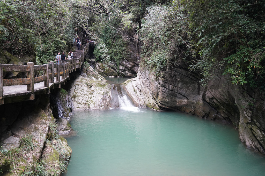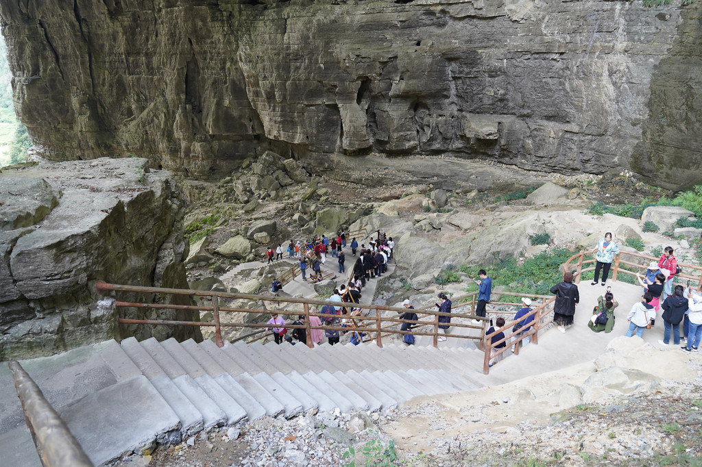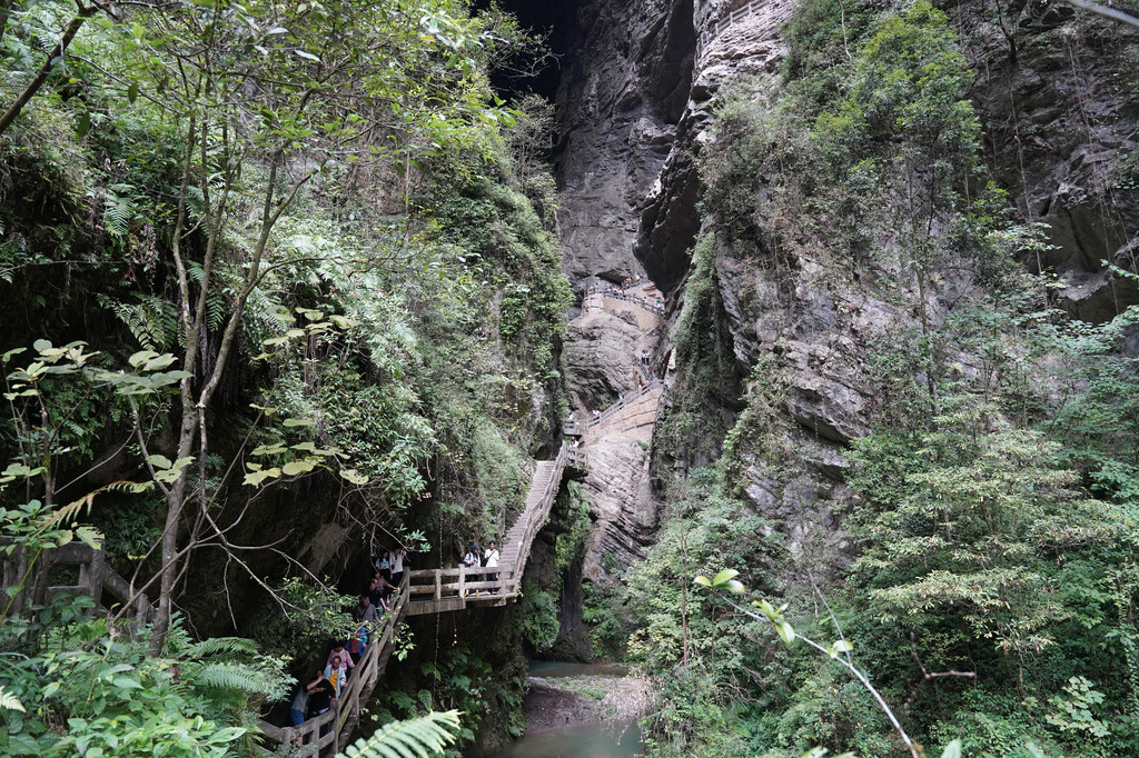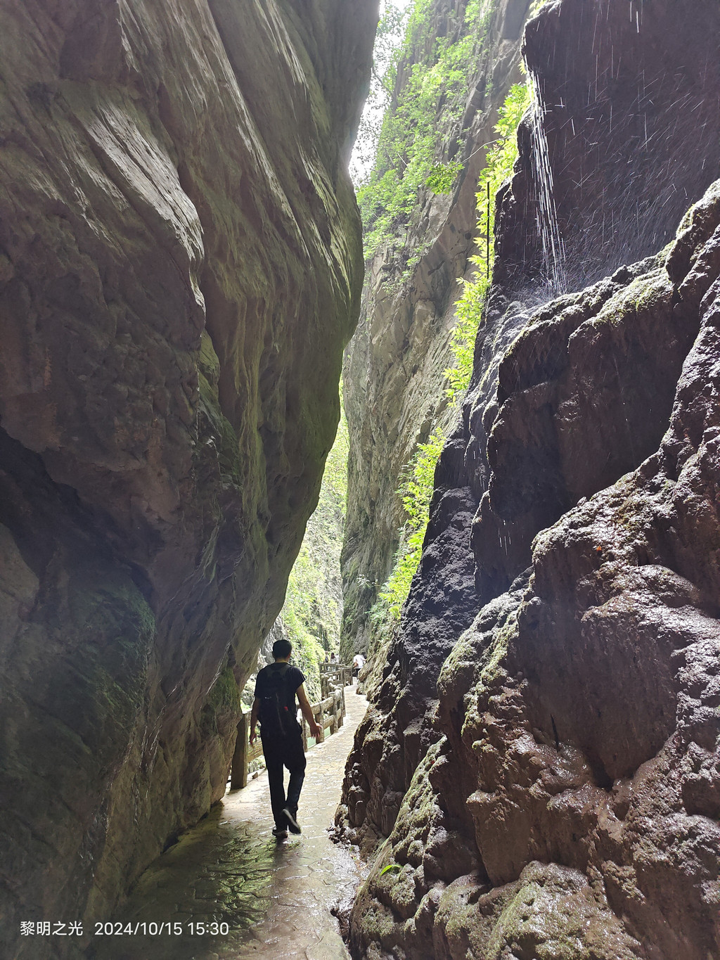地缝式峡谷幽深曲折,壁立千仞,一路上无数高高低低沿山开辟出的阶梯,有些路段无法直立行走,必须弯腰通过,有些路段狭窄到只能容一人通过,地缝的飞瀑流泉很多,栈道湿滑,头顶上不断落下山水。