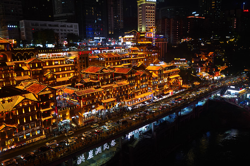 灯火通明的游船穿梭其上,动感十足,江对岸摩天大楼上五颜六色,电子屏不断出现各种广告语,让你目不接暇,洪崖洞在夜色灯光的勾勒下,显现出吊脚阁楼高高低低,错落有致的层层外形,通明透亮、金碧辉煌,感觉眼前是一个宫殿,亦或是一个金色的童话世界,有着奇异世界的神秘感,让人惊叹。