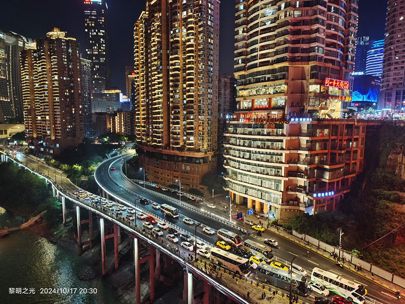 看得尚未尽兴,突然下起了小雨,我们没等到千厮门大桥和对面高楼大厦的灯光秀,乘坐滴滴快车回宾馆。
