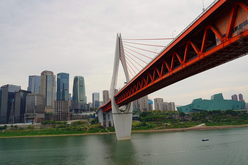 我们沿嘉陵江滨河步道前行,吹着江风,观着江景,享受着这段美好时光。到千斯门大桥了,这是重庆最美的网红大桥,如一条巨龙横跨在嘉陵江上,壮观奇特。旁边是依山错落有致而建的红崖洞,美丽吊脚楼与现代化的高大建筑完美融合在一起。