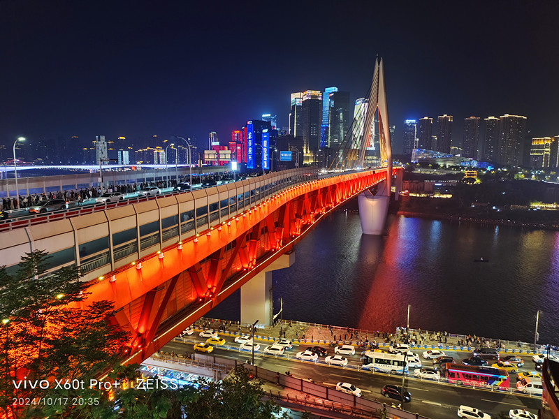 华灯初上,车水马龙,游人如织,大大小小的店铺内热闹非凡。傍晚时分重庆人的夜生活才拉开序幕。前面千厮门大桥似长虹卧波,雄跨两岸,在璀璨灯光的装点下,更加雄伟壮观,嘉陵江在两岸灯光的映照下,波光粼粼,五彩缤纷。
