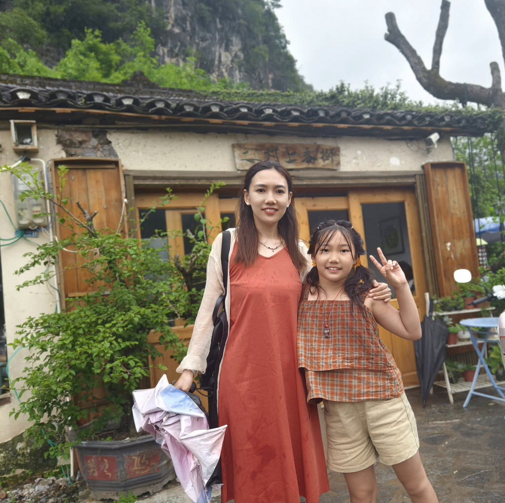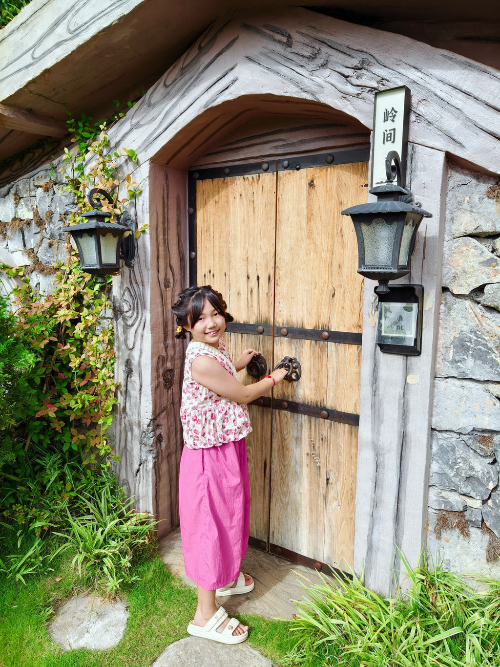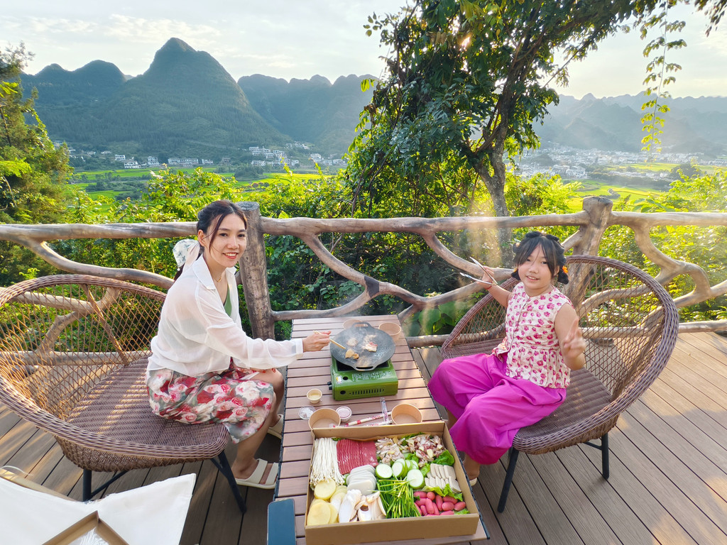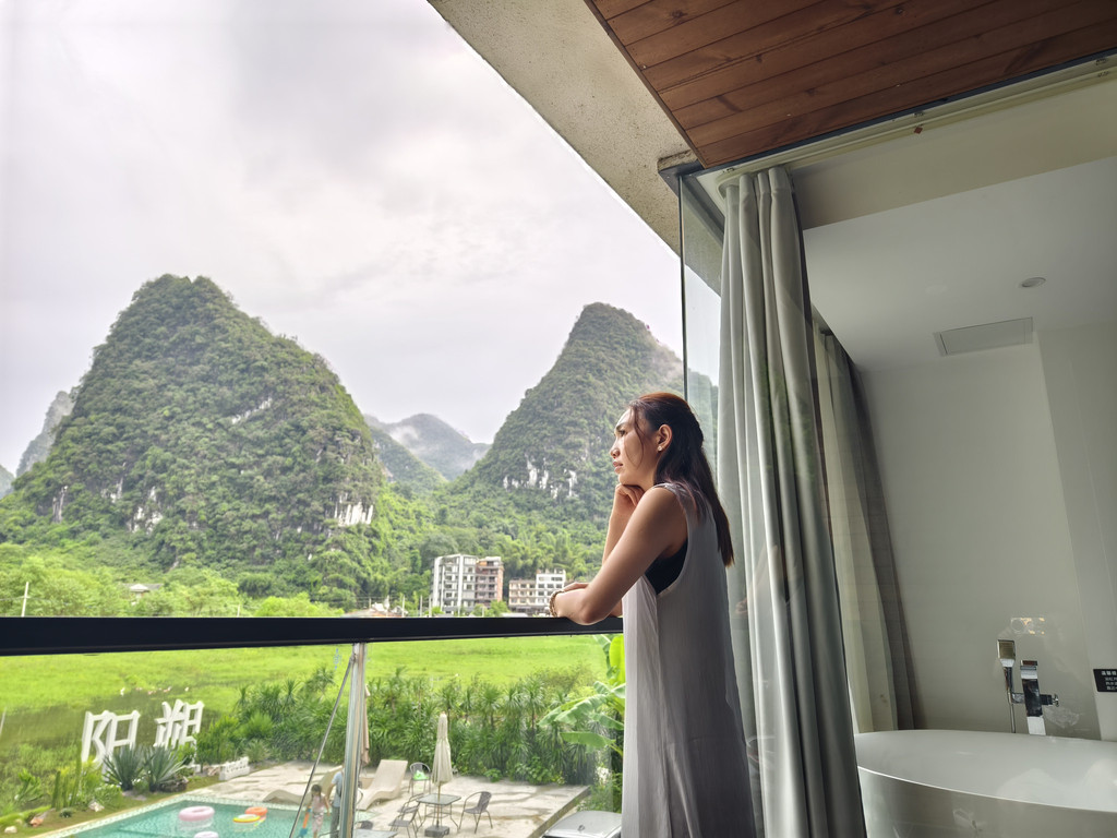 今天预定的是遇龙河附近的一家民宿,也是在网上找了很久,从露台能看到漂亮的山景,院子里还带了露天的泳池,因为刚下过大雨,泳池的水不太干净,就没有让孩子下去游泳。