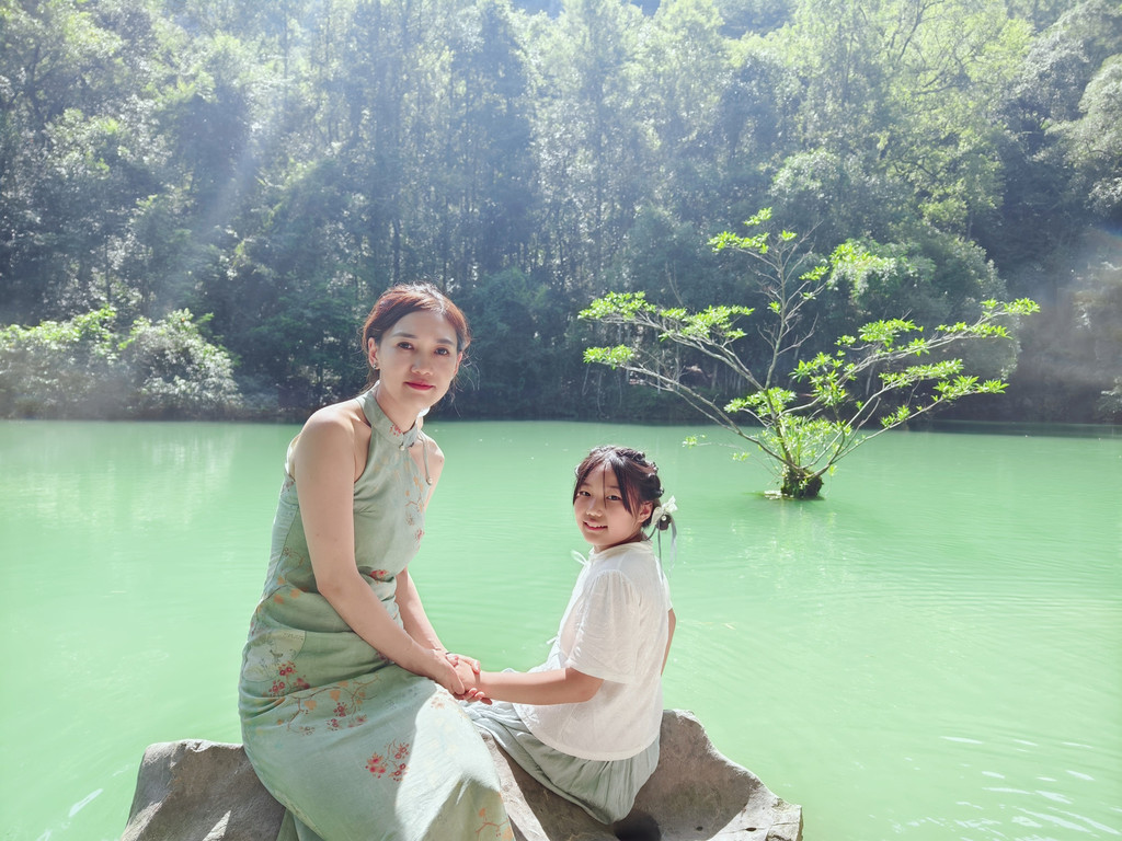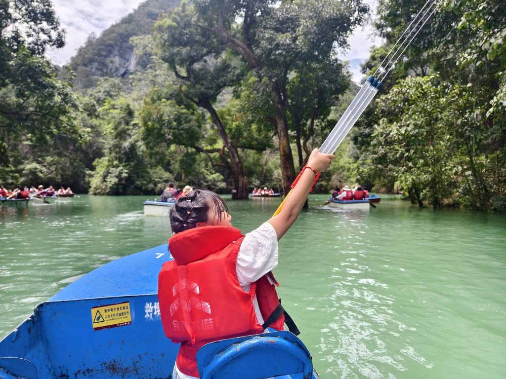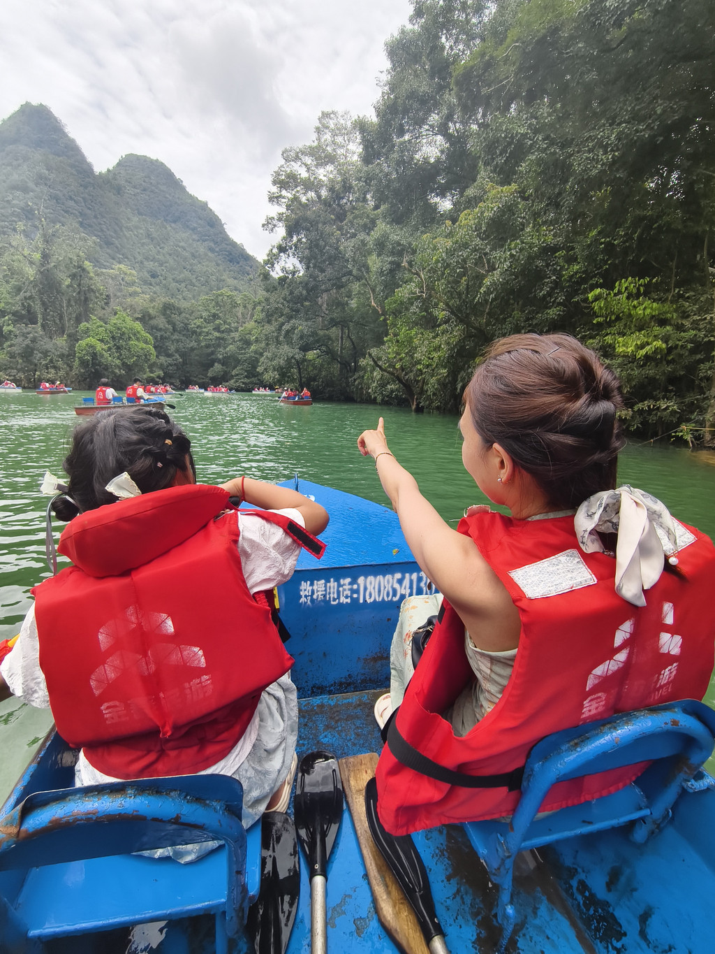 吃过早饭收拾完东西把行李存放在酒店,等车辆放行后会把行李送到景区外。我们九点多正式开始景区的游览,从小七孔古桥到68级跌水瀑布,然后坐车到叠翠瀑布,这里的水很浅,是孩子们玩水的天堂,跟孩子在这里玩了很久。然后就到了今天的重点项目-鸳鸯湖划船,这个时间段正好赶上游客高峰,所有排队排了很久。这个湖的特点的是湖水在一片森林里,可以划船在树林里穿梭,我们怕划船太累,所以请了船工帮我们划,在比较窄的拥堵水段船工也能也能快速通过,这样我们可以专心的欣赏风景。把船工送上岸后我们自己又划了很久,划累了就把船停在树林里休息,很是惬意。