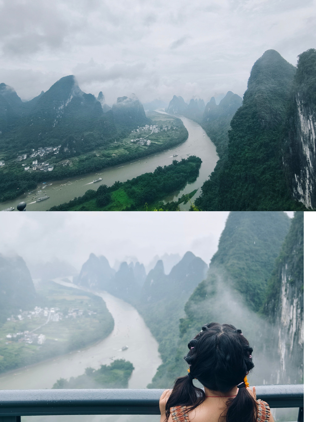 因为昨天下雨没有去爬相公山,看今天早起雨停了,决定再去一趟,开了段盘山路到达景区门口,购票进景区开始向上爬,爬到观景台还是有些累,但是看到这绝美的景色觉得一起都挺值的。雨虽然停了,但是天还是阴沉,所以景色还是有些打折扣。蜿蜒的漓江从群山中流过,像是一幅绝美的山水画。