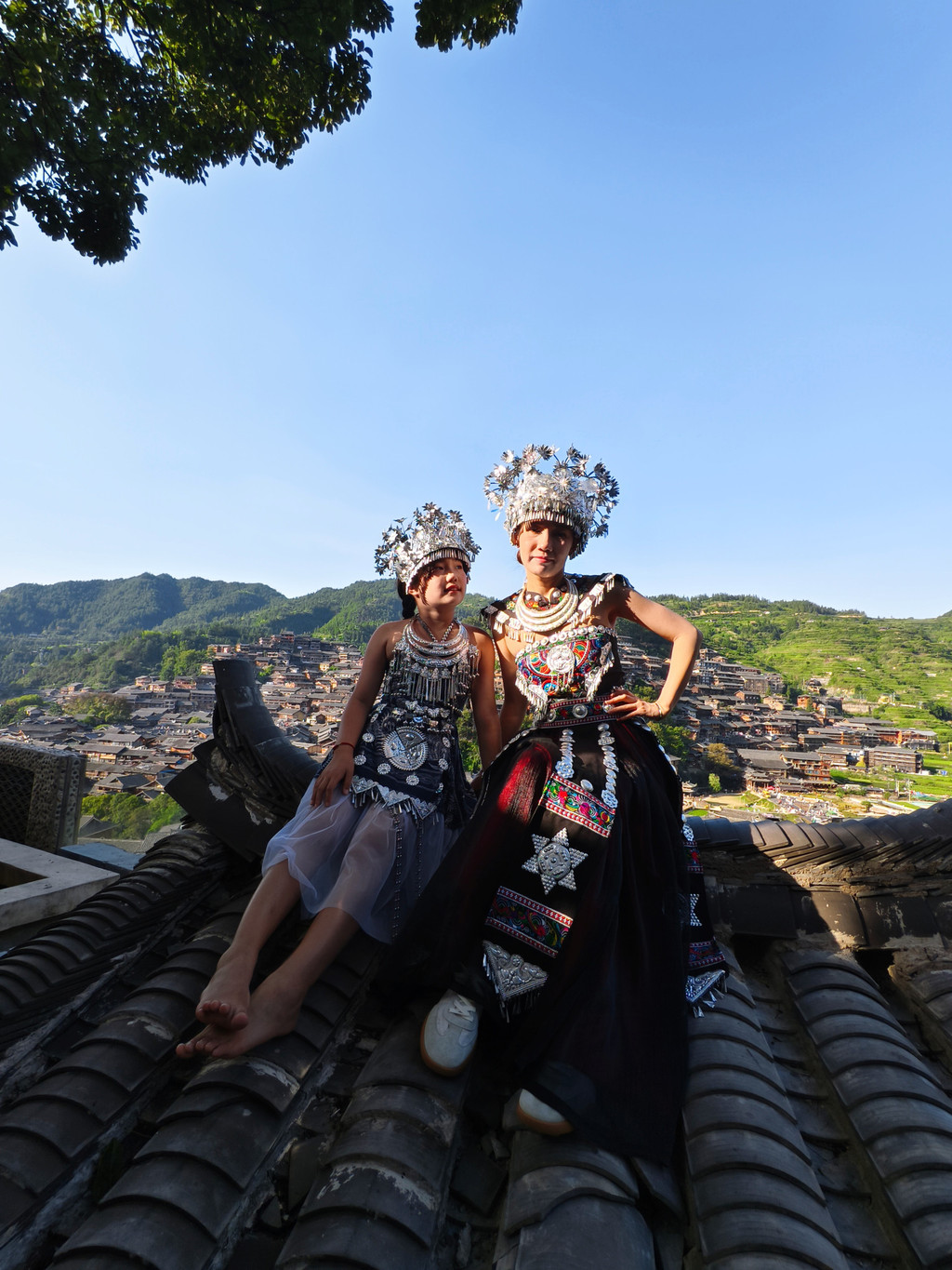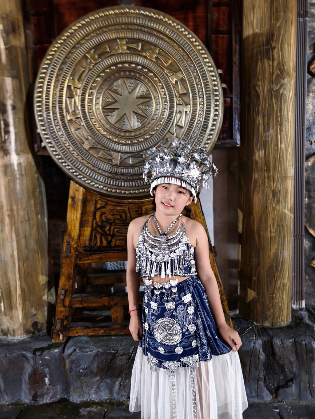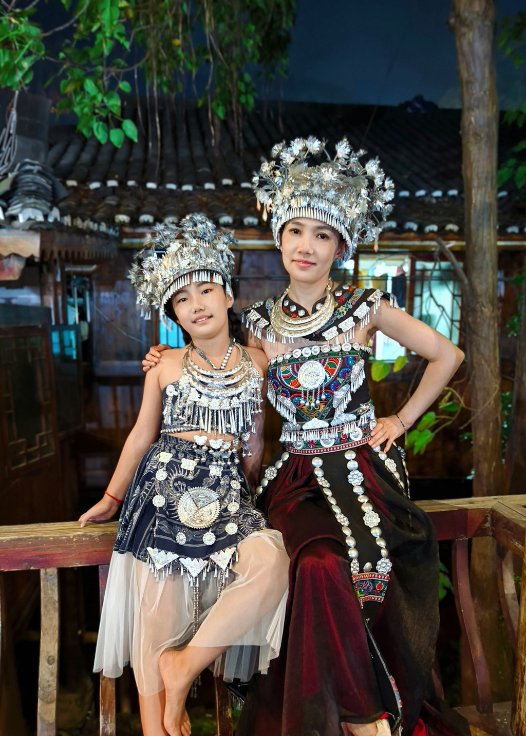 今天出发去西江千户苗寨,到景区买完票下午三点多。今天和闺女打算租一身苗服,随便找了一个比较大的店铺。闺女不喜欢特别浓的妆,我俩都化了一个简妆。穿着苗服穿梭在苗寨中,感受着民族特色。