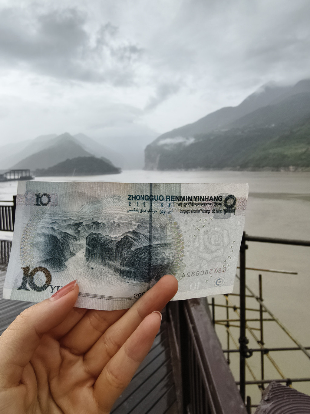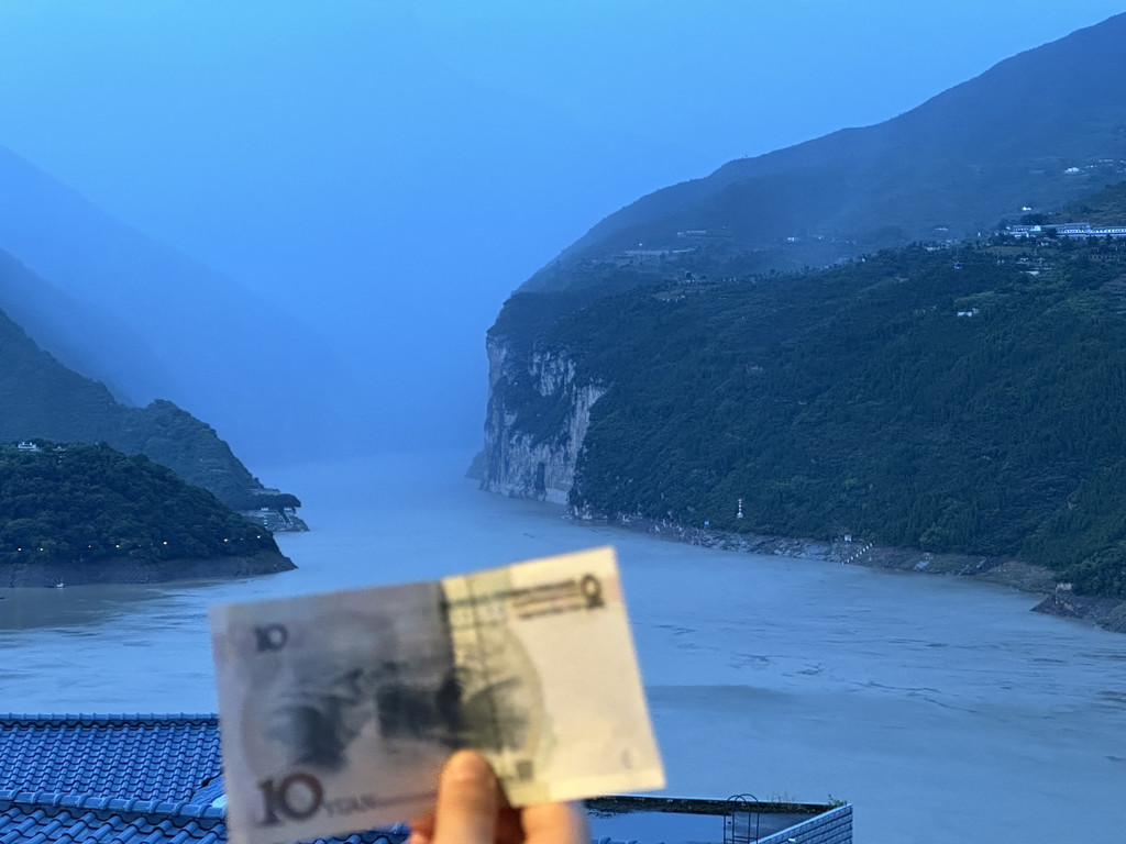 经过湖北进入重庆,明显感觉隧道越来越多,天气越来越阴沉,到奉节县城就开始下雨,快七点才到预定的酒店。今天的酒店是奉节夔门大酒店,从房间的阳台上就能看到10元人民币背景图案的景色。只是今天因为天气阴沉,看的不是很清晰。