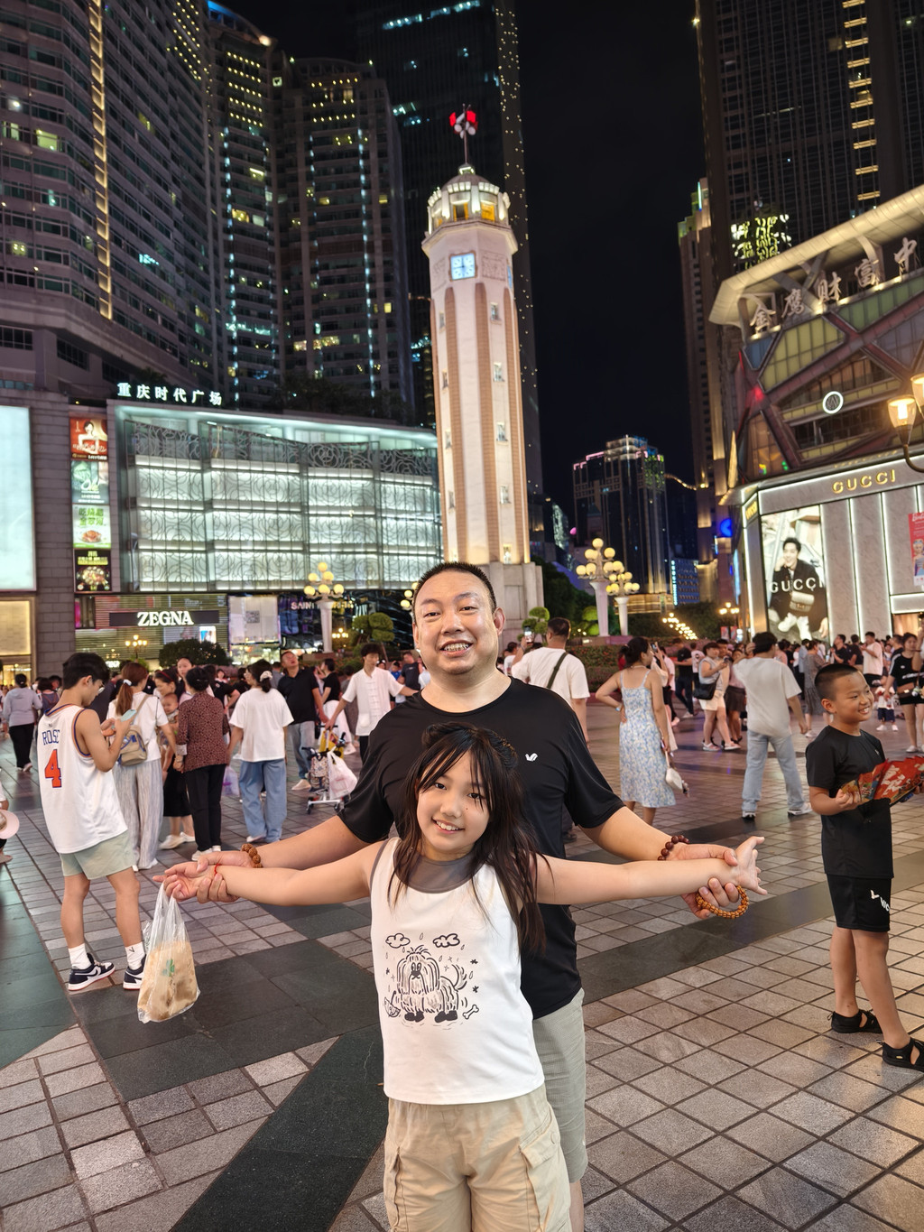 刚到重庆就感受到这个火炉城市的温度了,所以我们打算先休息,太阳快下山在出去逛逛。为了省心,打算打个车去解放碑,司机中途给我们介绍跟团的一日游,因为我不想那么累,明天就想自由自在的逛逛就好,所以就拒绝了。后来听了司机的推荐,去吃了重庆火锅,店里人还挺多,味道还可以,但是价格不算便宜。司机说这里离解放碑很近,但是吃完饭我们跟着导航走着走着就绕晕了,最后又坐电梯又爬楼梯才走了解放碑,在重庆导航真的会失灵。