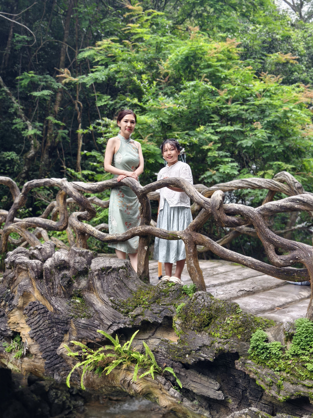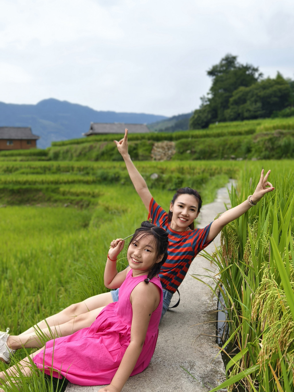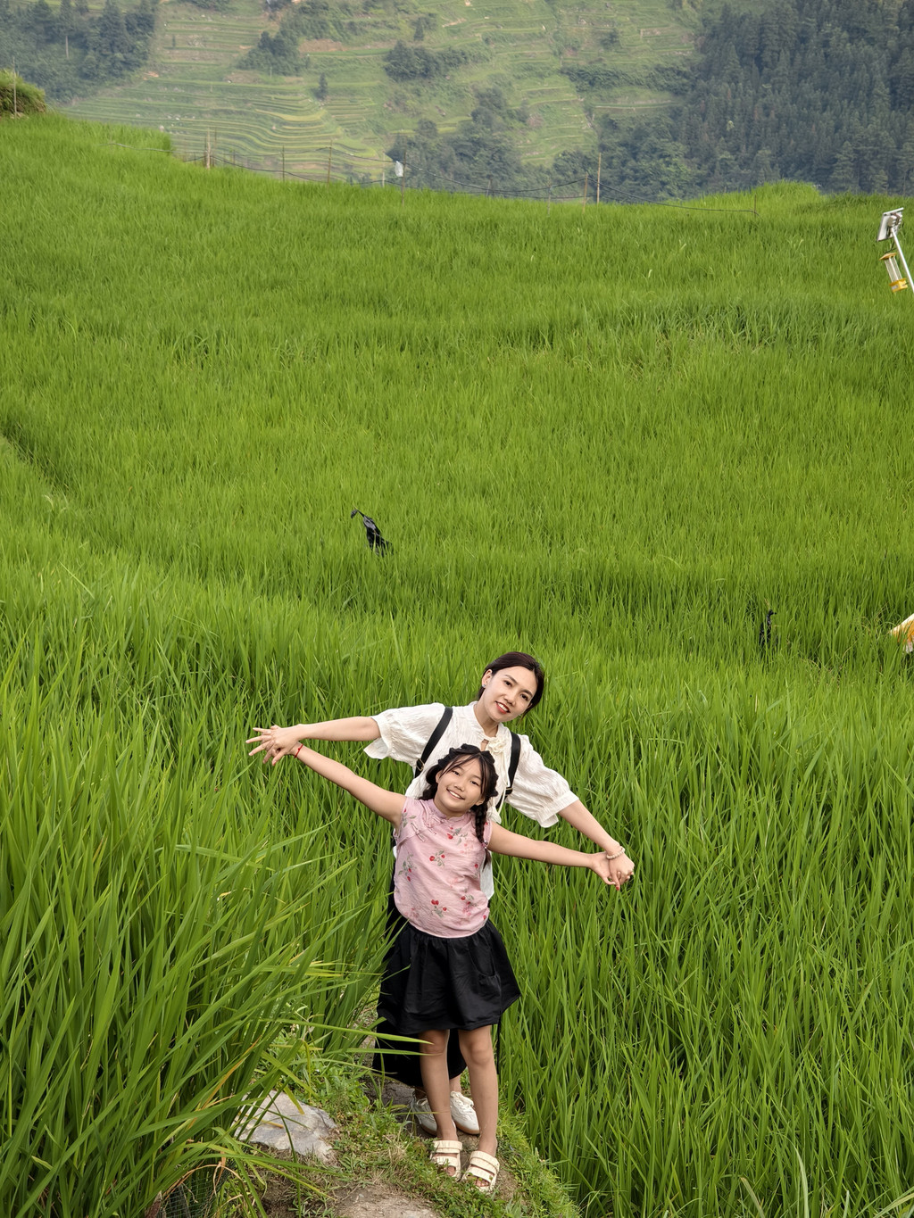 先坐景区的观光车到一号风雨桥,跟着导航爬到半山坡的猪圈咖啡,跟着小红书找到了网红秋千和房顶,只不过人太多,拍照还要排队。不过这里景色真的是非常棒,可以从山上看到对面错落有致的苗寨。从山上下来回到一号风雨桥,可以看到一片稻田。在稻田里拍了很多照片。老公因为走路没注意,不小心掉到了水田里,弄了一裤子的泥,所以走在田间还是要小心。