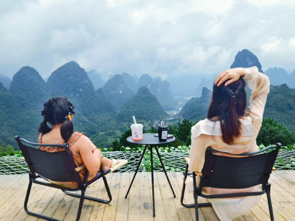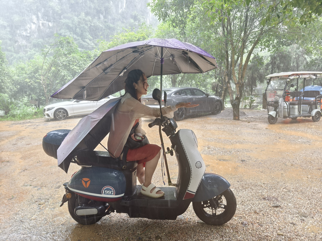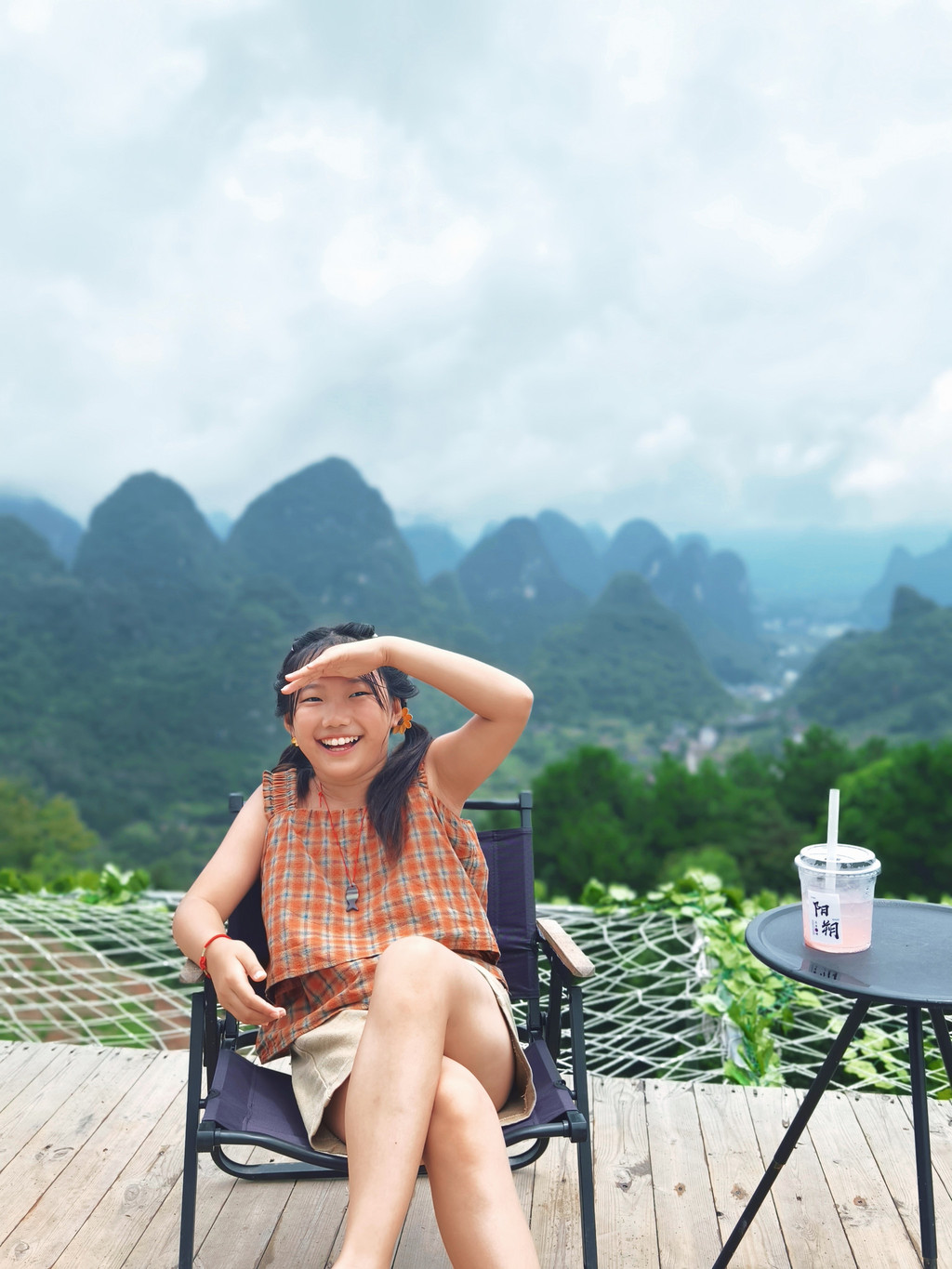 从相公山下来后到了阳朔的县城,从这里租了两辆电瓶车游览了十里画廊。感觉这里的景色和万峰林相似,一样的山峰,一样的稻田,就是多了一条遇龙河,但相对来说,我还是更喜欢万峰林的景色。就是这雨时断时续,中途又被大雨困住,幸好租的电瓶车自带雨棚,停下来等雨停了才继续游览。这里的咖啡馆布置的都很浪漫,拍照也很漂亮。