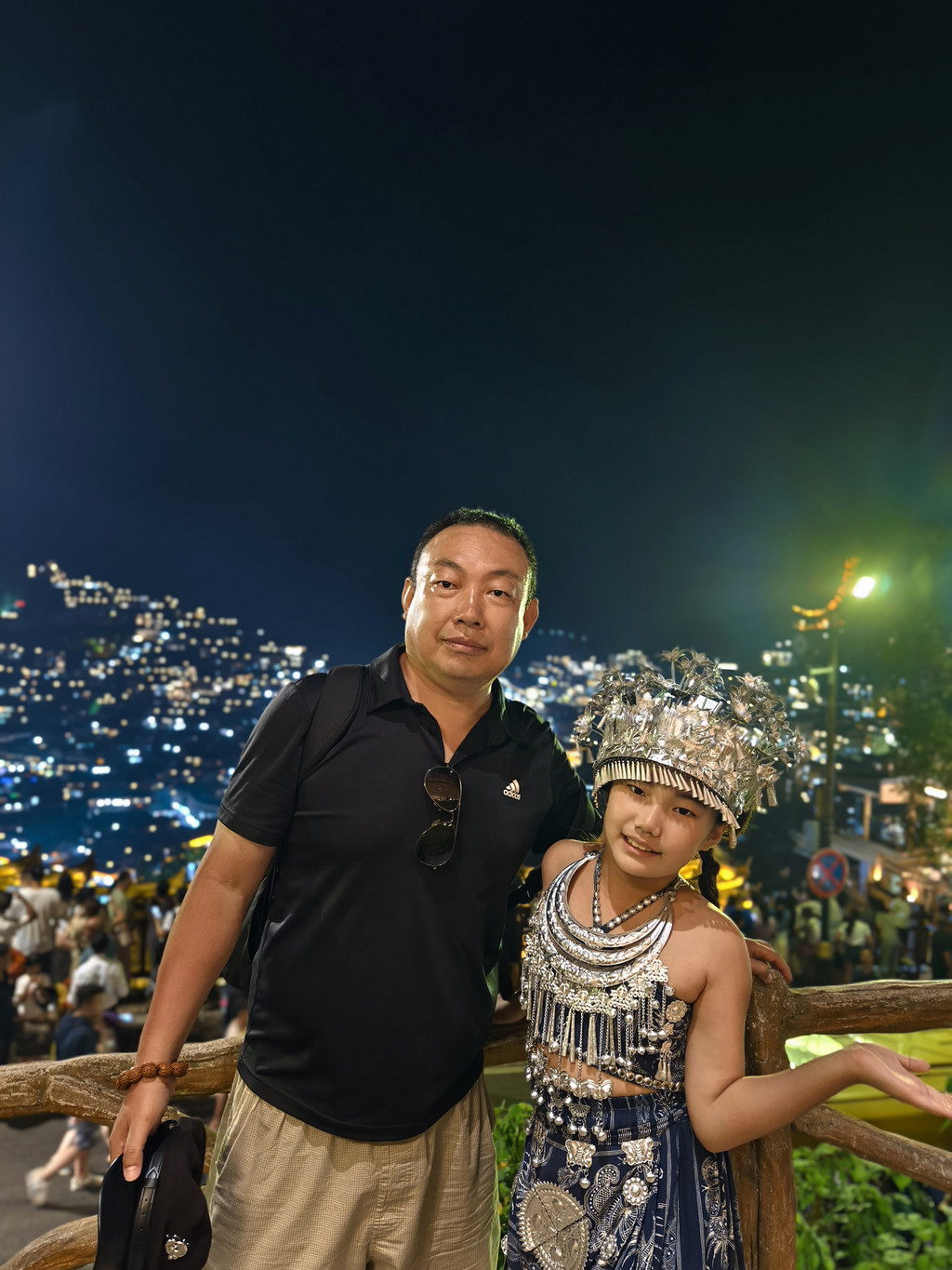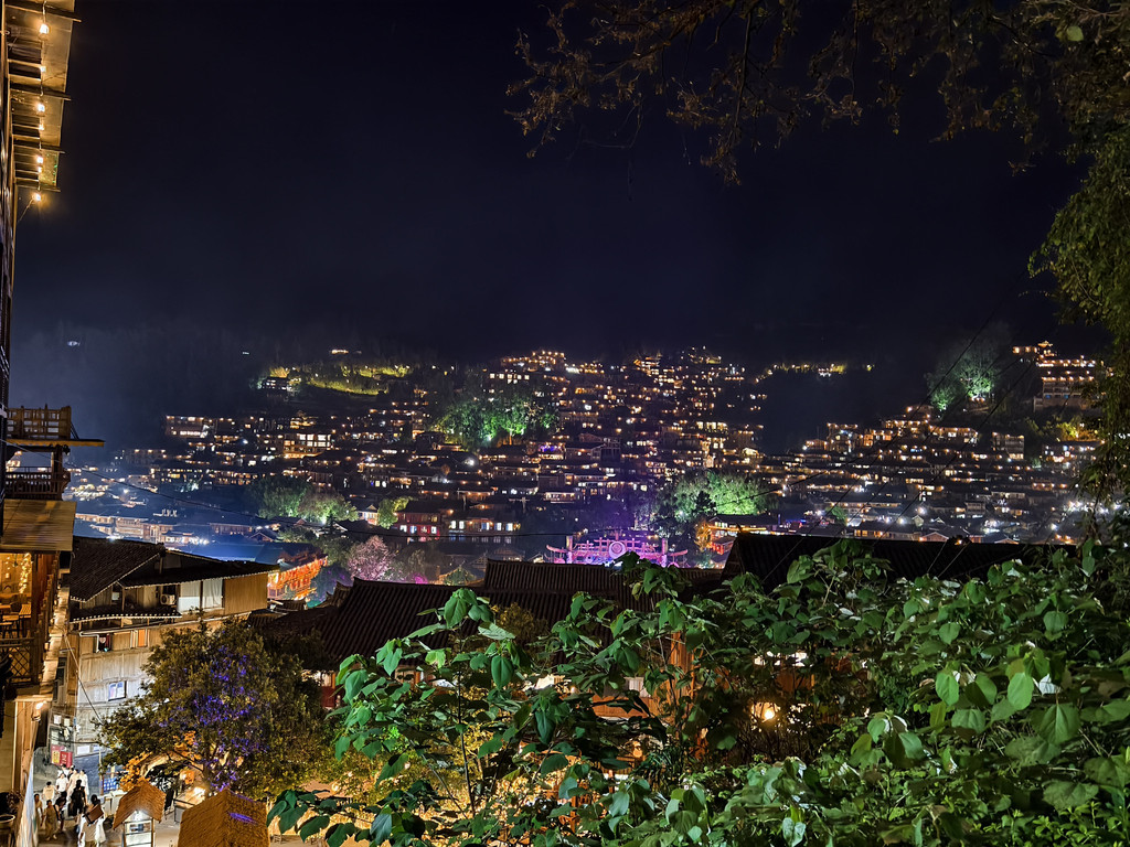 天渐渐黑了,苗寨中的万家灯火也慢慢亮了起来,我们从一号风雨桥一直往苗寨中走。然后顺着小路爬到了观景台。从这里能够俯瞰整个苗寨,这里是欣赏夜景最佳的位置。看着万家灯火,非常浪漫。