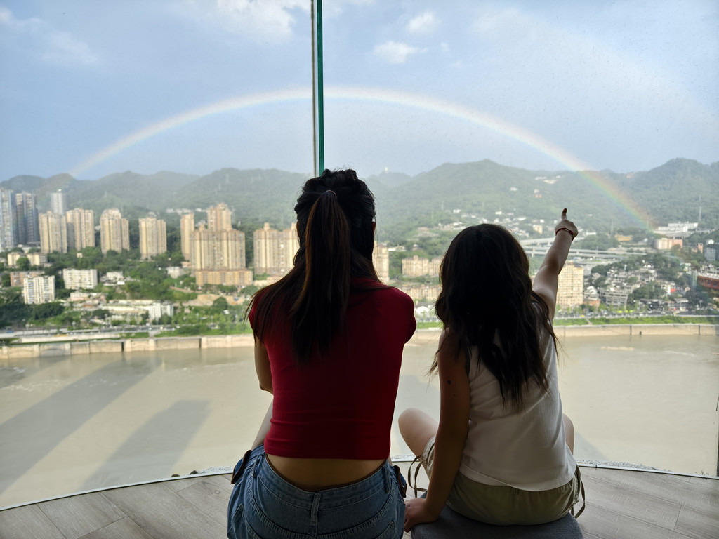 都知道重庆是个立体城市,外地的司机开车来很容易被绕晕,所以最好的方式就是把车停在酒店,一切出行都打车。我在网上预订了朝天门靠长江边的高层民宿,为了晚上欣赏整个重庆的夜景。下午三点多到了重庆市区,一路战战兢兢的跟着导航走,生怕一个不注意走错路。还算顺利到了公寓的地下停车场。到了民宿房间就通过大落地窗看到了一道清晰的彩虹,心情也变的更美丽了。