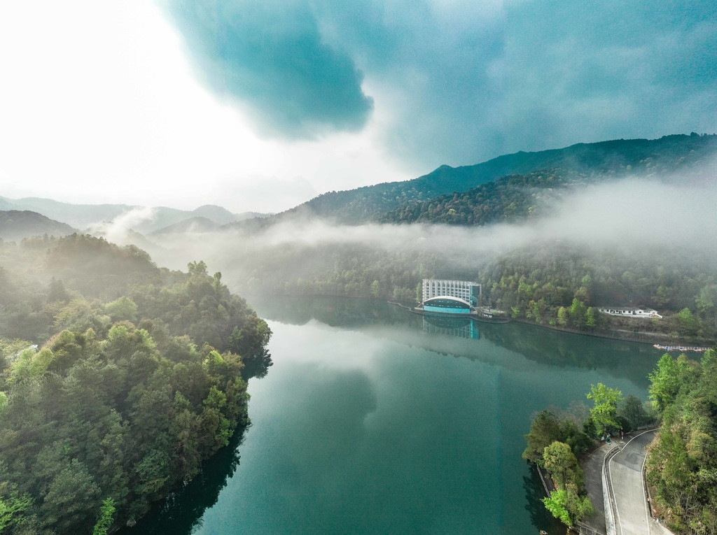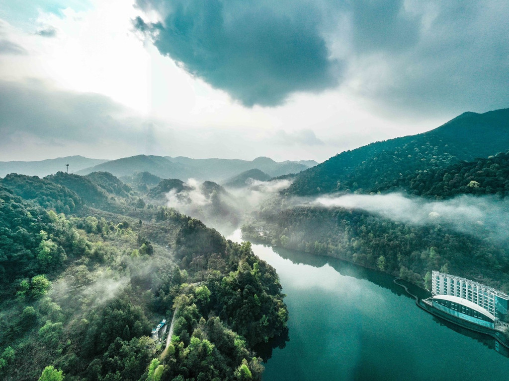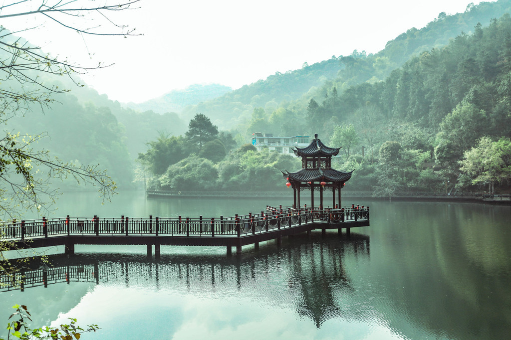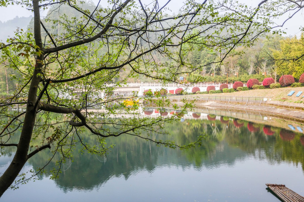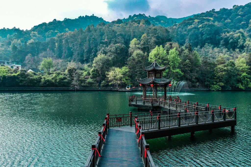 在山上流下的河水非常清澈,汇聚在这里,变成了一块有如镶嵌在青山中的碧绿翡翠,璀璨而动人。