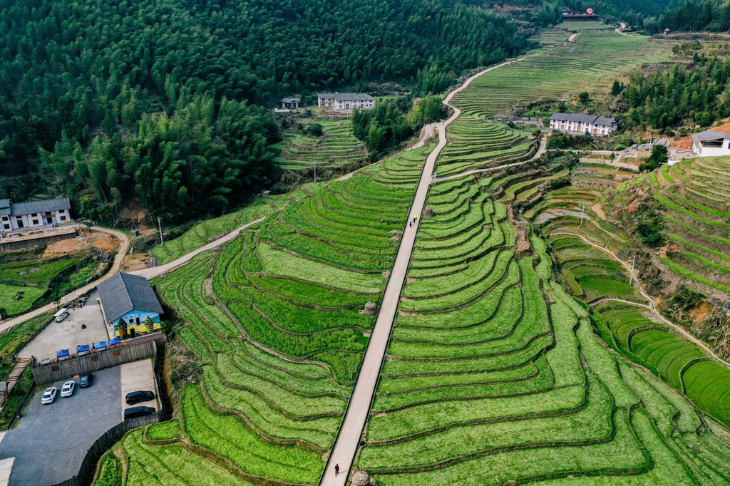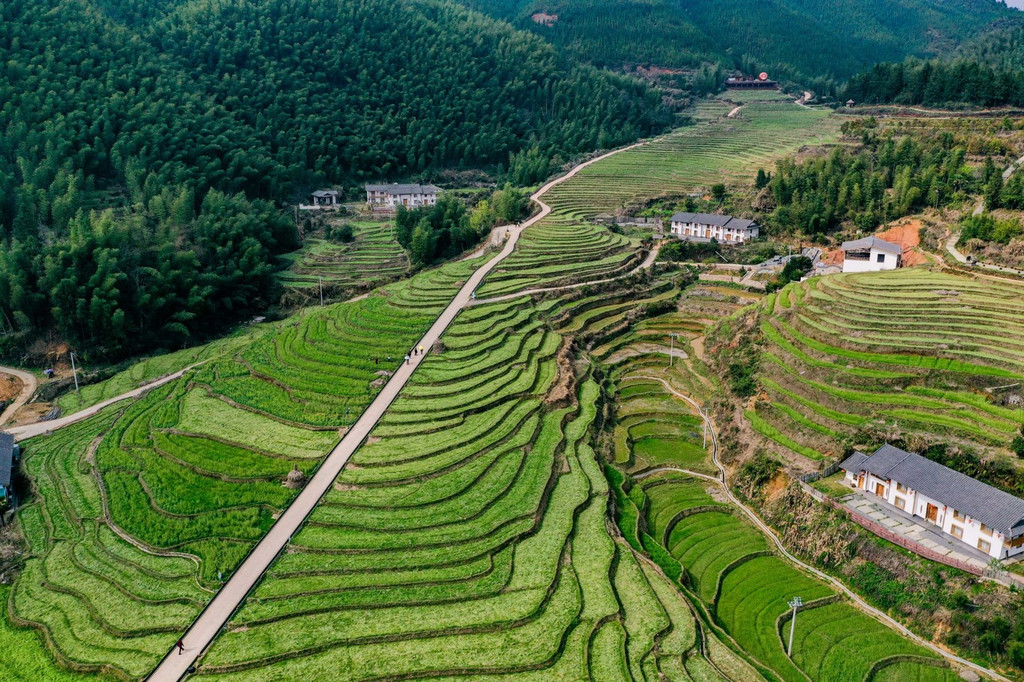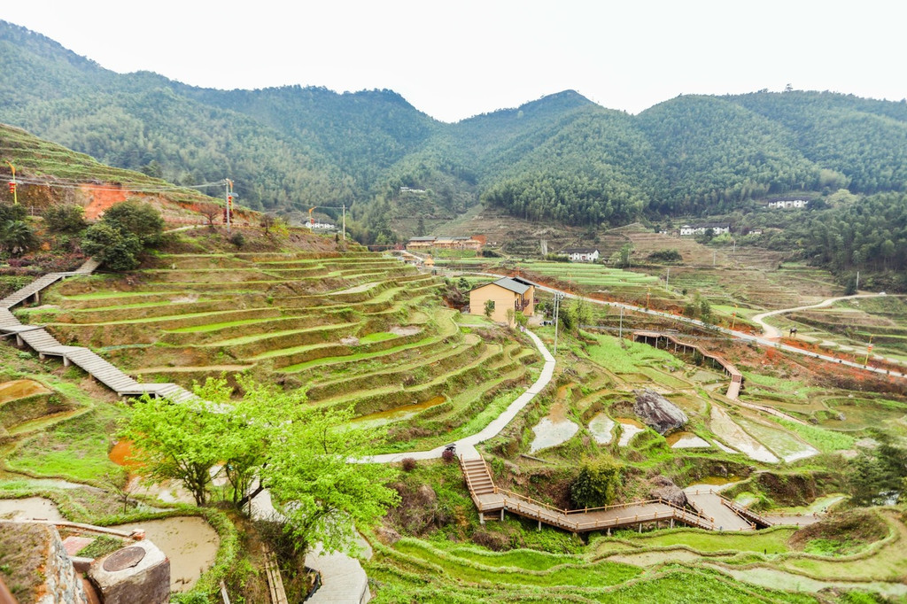 来到山顶同样设置了观景台,在观景台上俯瞰梯田的青绿与苍郁,感受一下属于古代客家人的智慧与勤劳,这个用双手在大山间创造出的奇迹。