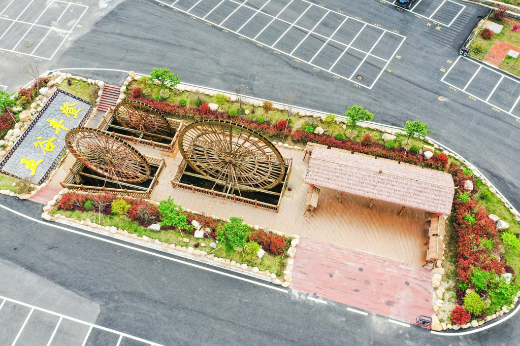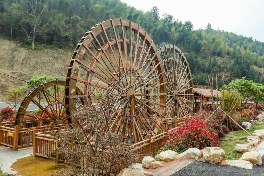 大水车在梯田前,有着古朴的味道,形成了一幅美好的田园画卷。