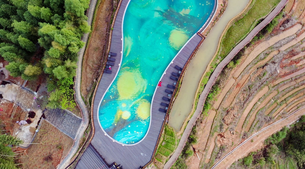 泳池用了不规则圆形,泳池底部的瓷片贴成了梵高的名画,非常特别。在这里能够俯瞰梯田的美景,在泳池边感受凉风习习,就是属于上堡的一种休闲小时光。