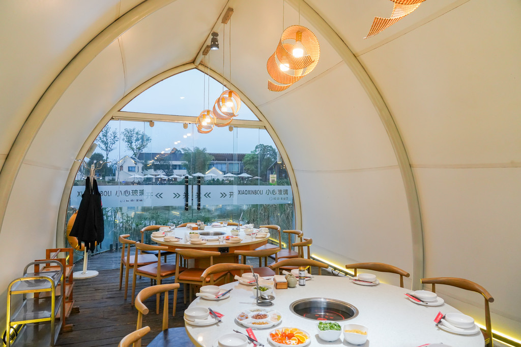 一个个白色的拱顶小房子紧临湖边围成一圈,赏着湖光美色,享着火锅美味,还有现场歌舞表演,如此惬意的生活谁不想拥有呢?