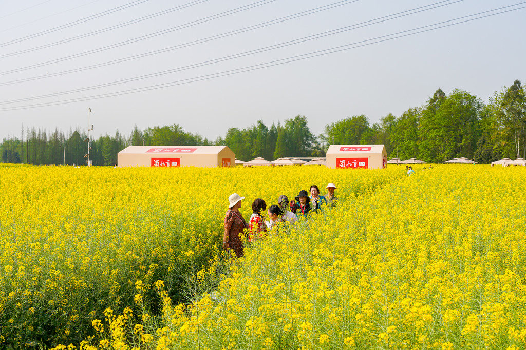 田园都市赏花节1号营地,这里是四川·崇州自驾赏花节的主要打卡地,超大面积的油菜花田中,还结合当地文化、融入了非遗元素和艺术主题,让油菜花田更加灵动起来