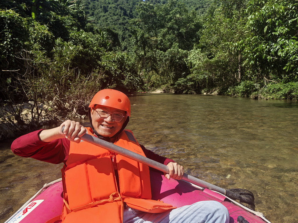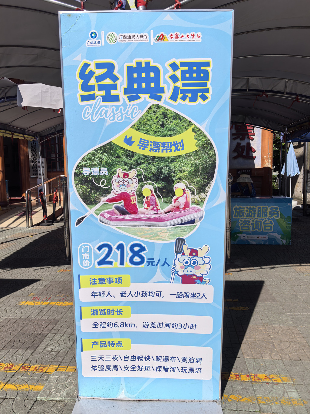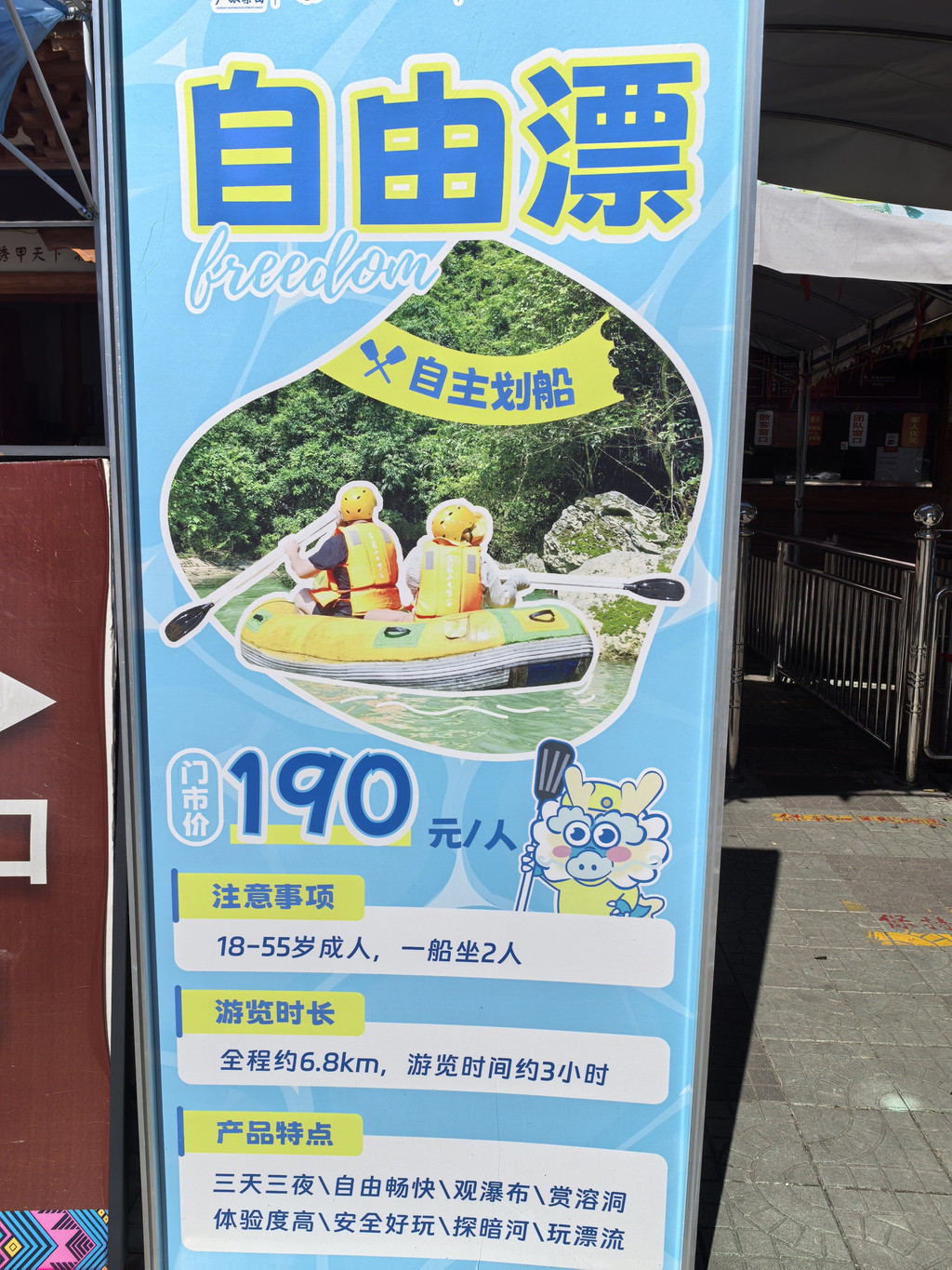 全长6.8km 三峡 两洞漂流,有经典漂导漂员代划和自由漂自己划两种。我主观意愿其实第一感觉就是想自己划,但作为一个从来没划过皮划艇甚至都没漂流过的人来说,我也不知道这到底有没有难度能不能完成。另外老爸的年龄其实被卡在自由滑之外的。但感谢向来胆大的老爸支持了我的想法,愿意和我一同尝试。于是我们现场和工作人员沟通了是否可以买自由划票,主划手是我,老人坐后面,这样结构上老爸和坐经典划一样。