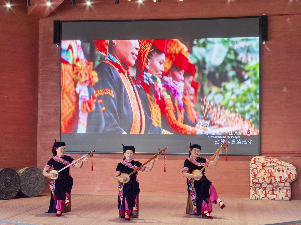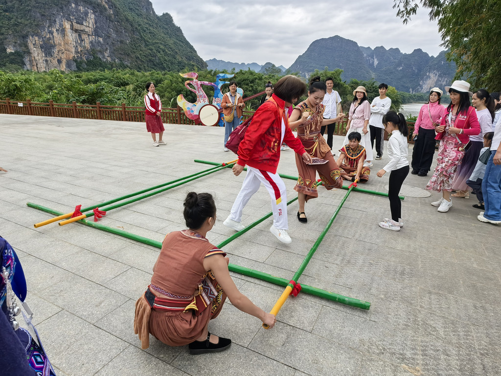 第二次上岸基本就是一些民俗表演、购物环节,有一个长长栈道走到底正好是之前近看岩画的对岸,隔着江很远,几乎看不清画。