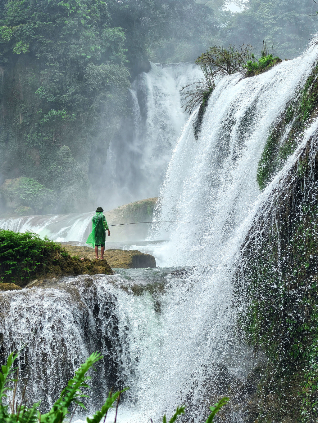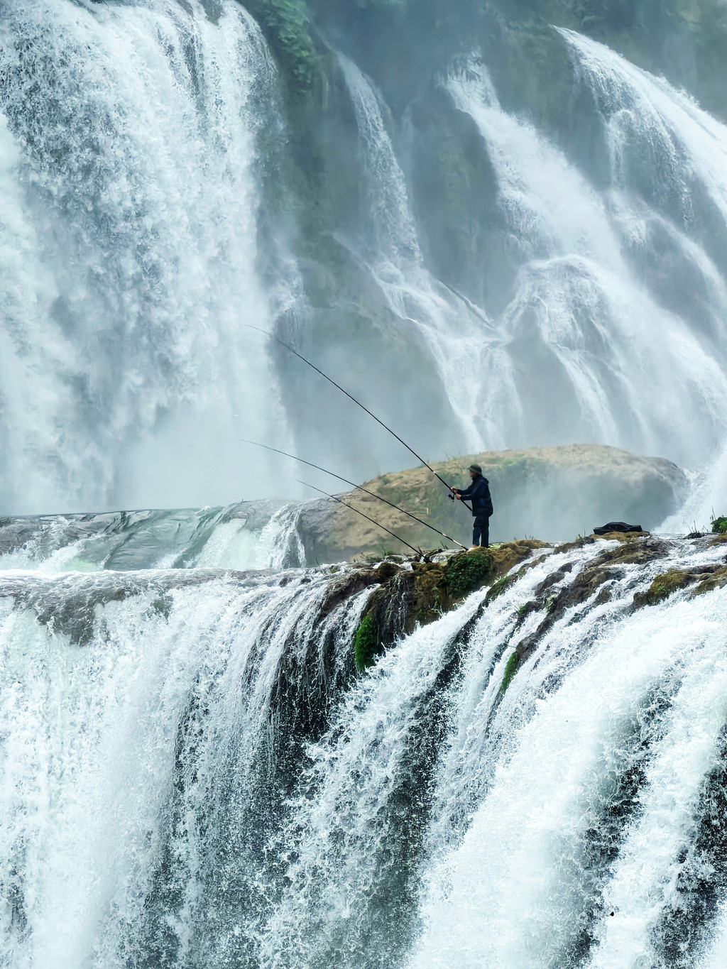 三级二级观瀑台是侧方位近距离的赏瀑点。很奇怪在瀑布里为什么会有钓鱼的人?是得到景区允许了还是景区安排的?有人理解吗,很好奇。但别说要能站在里面融合大瀑布拍照,真得很特别,特别像武侠片里修炼的高手。