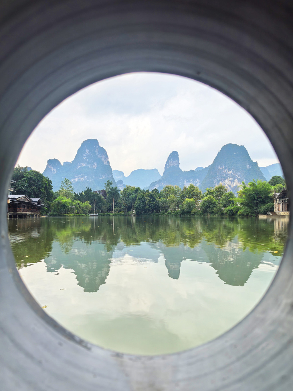 上岸后聚集人最多的就是在九曲桥上的各个圆孔里拍不同角度的一洞一景。