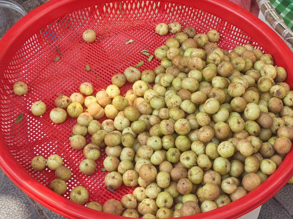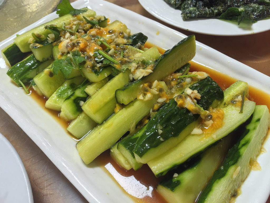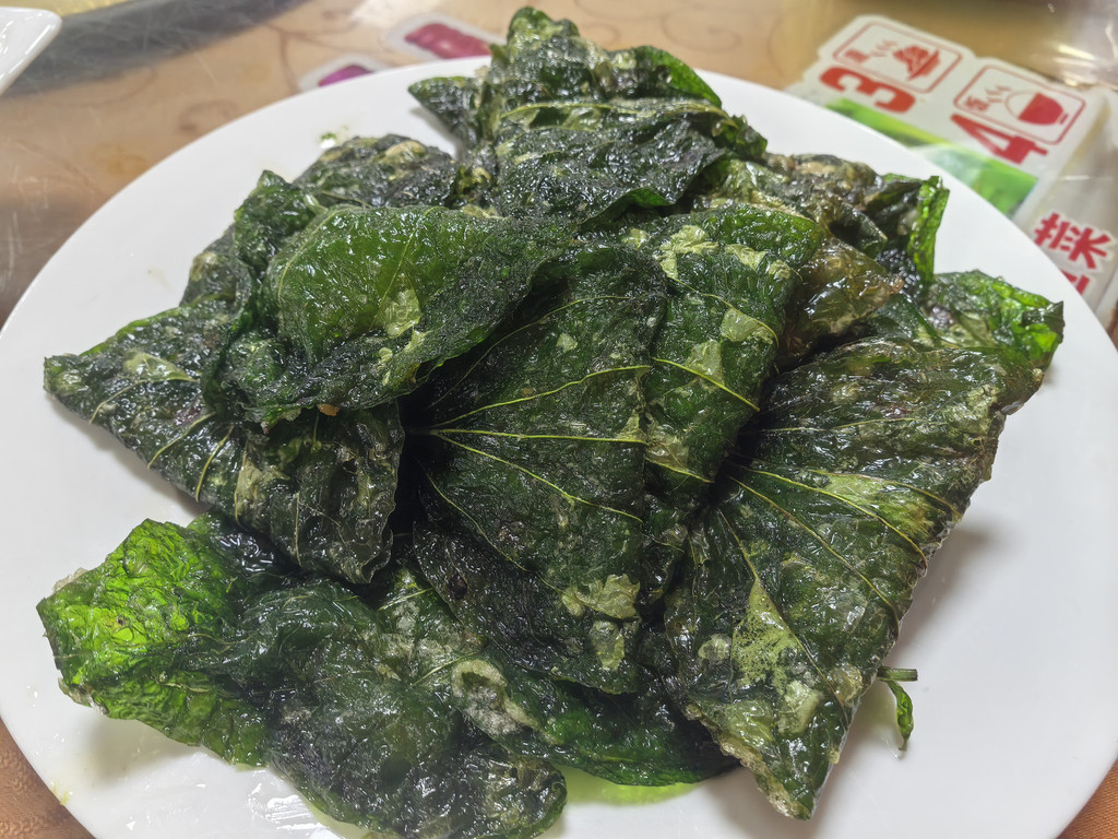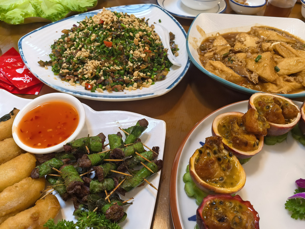 晚餐在附近的农家庄饭店,很大的大厅全是圆桌,应该有不少团队游会来这里。芒果炒牛肉、百香果黄瓜,水果入菜发挥到极致,假蒌叶包肉也是这里的特色。